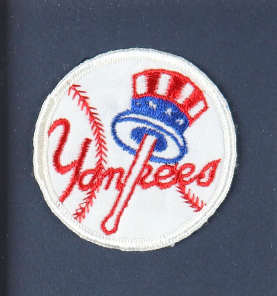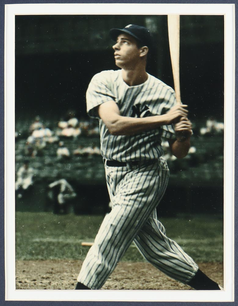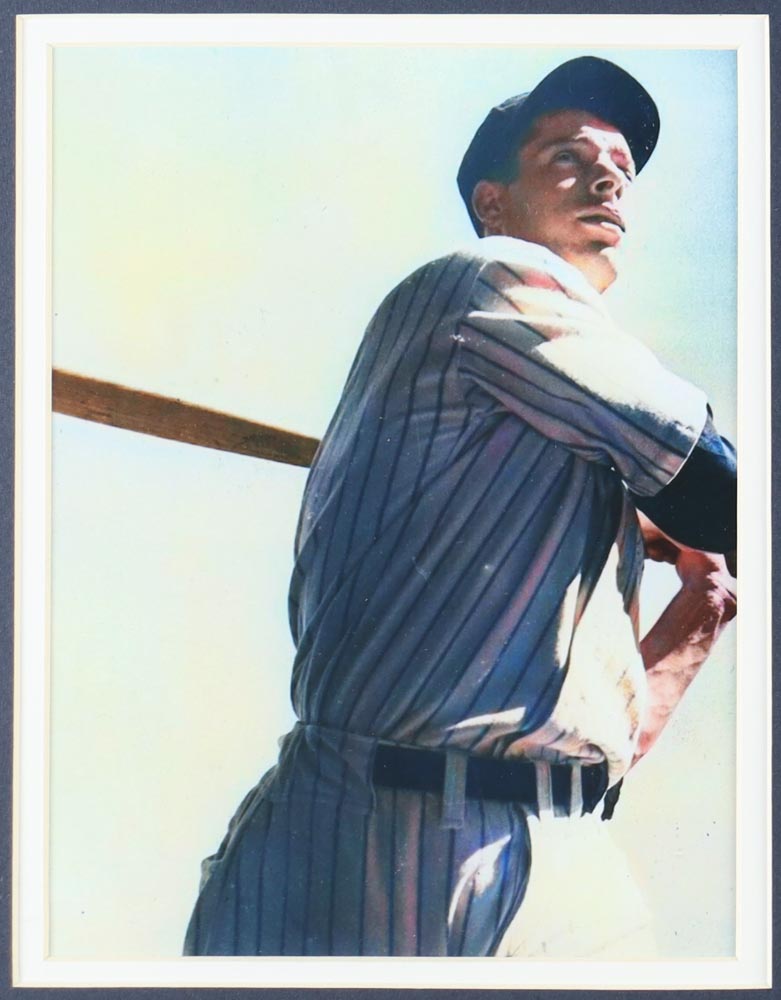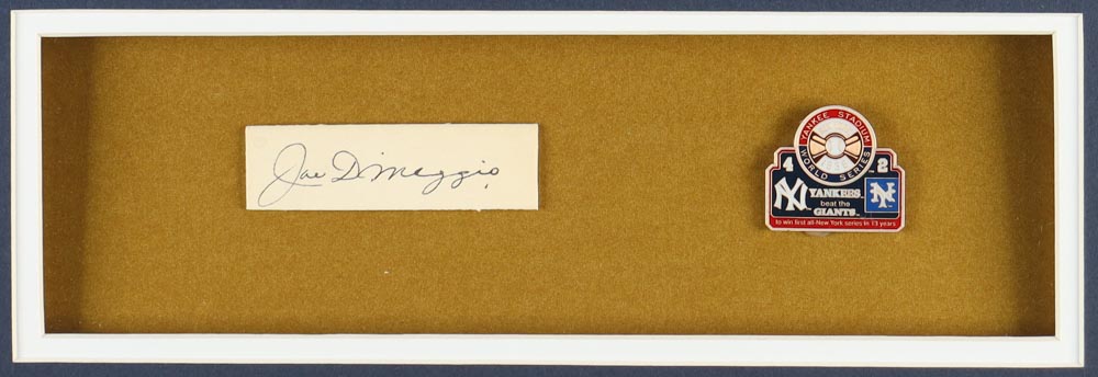 Custom frame measures 32" x 36" in size and features a cut that has been hand-signed by Joe DiMaggio (D. 1999, New York Yankees, HOF). Display also features an unsigned jersey and a 1936 World Series pin.