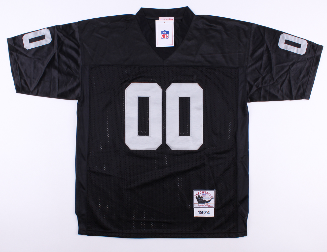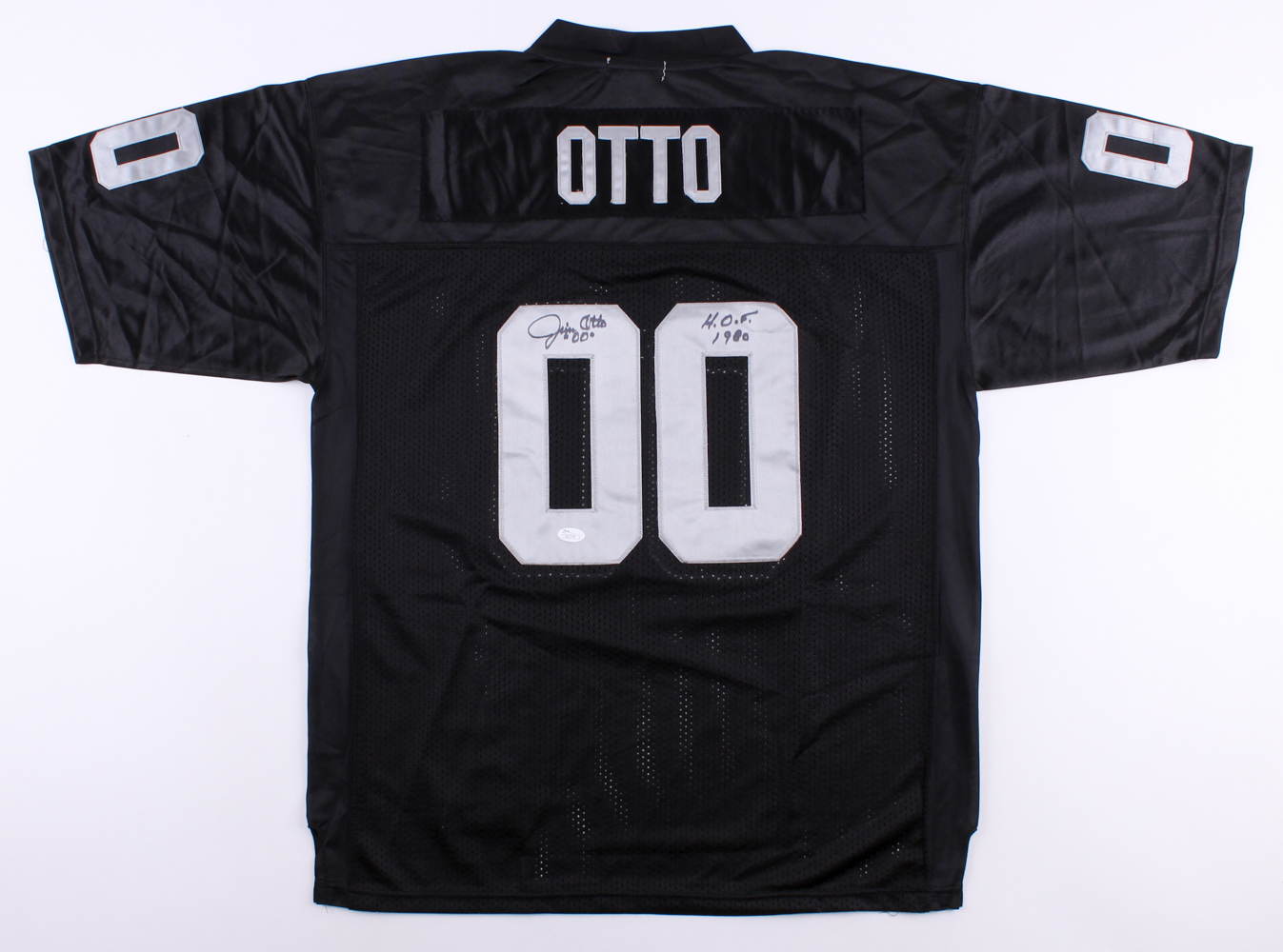 NFL Throwback on-field style jersey. Everything is sewn on, size 50. Hand-signed and inscribed in black felt-tip pen by Jim Otto (Raiders, HOF).