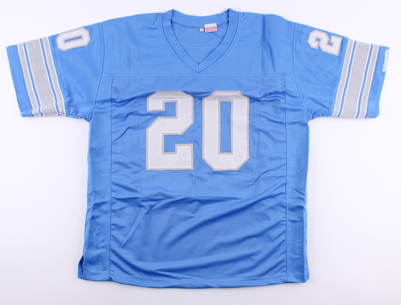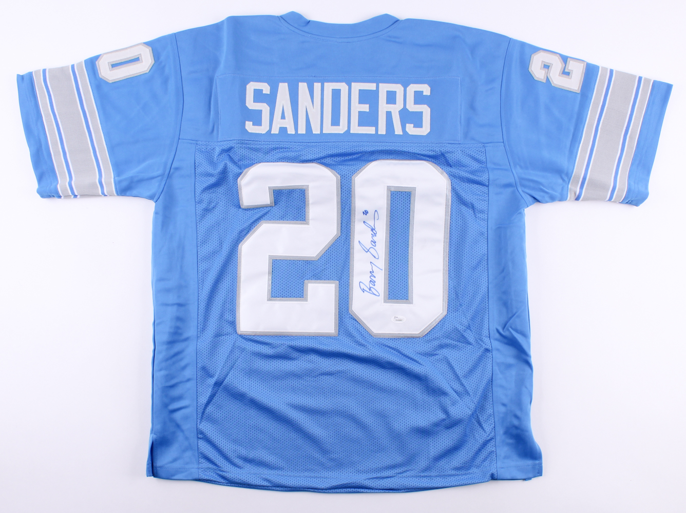 Custom on-field style jersey. Everything sewn on, size XL. Hand-signed in blue felt-tip pen by Barry Sanders (HOF). Please note, autograph has bled slightly. See photos for further details regarding condition of the jersey.