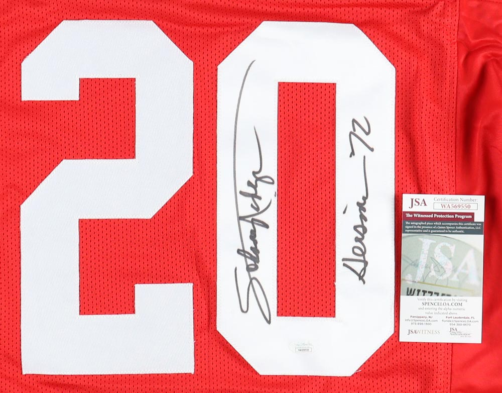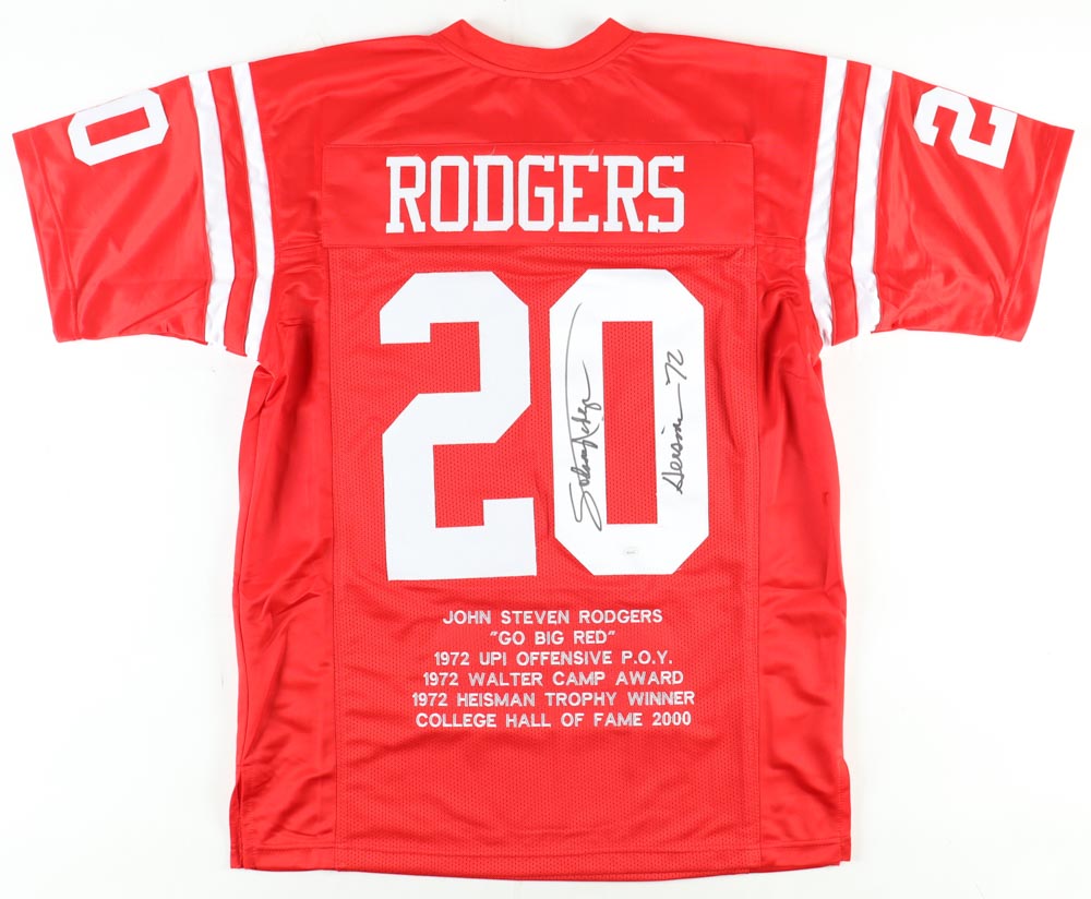 Custom jersey. Everything is sewn on, size XL. Hand-signed and inscribed by Johnny Rodgers. Please note that Rodgers' stats have been sewn on the back under the reverse numbers.