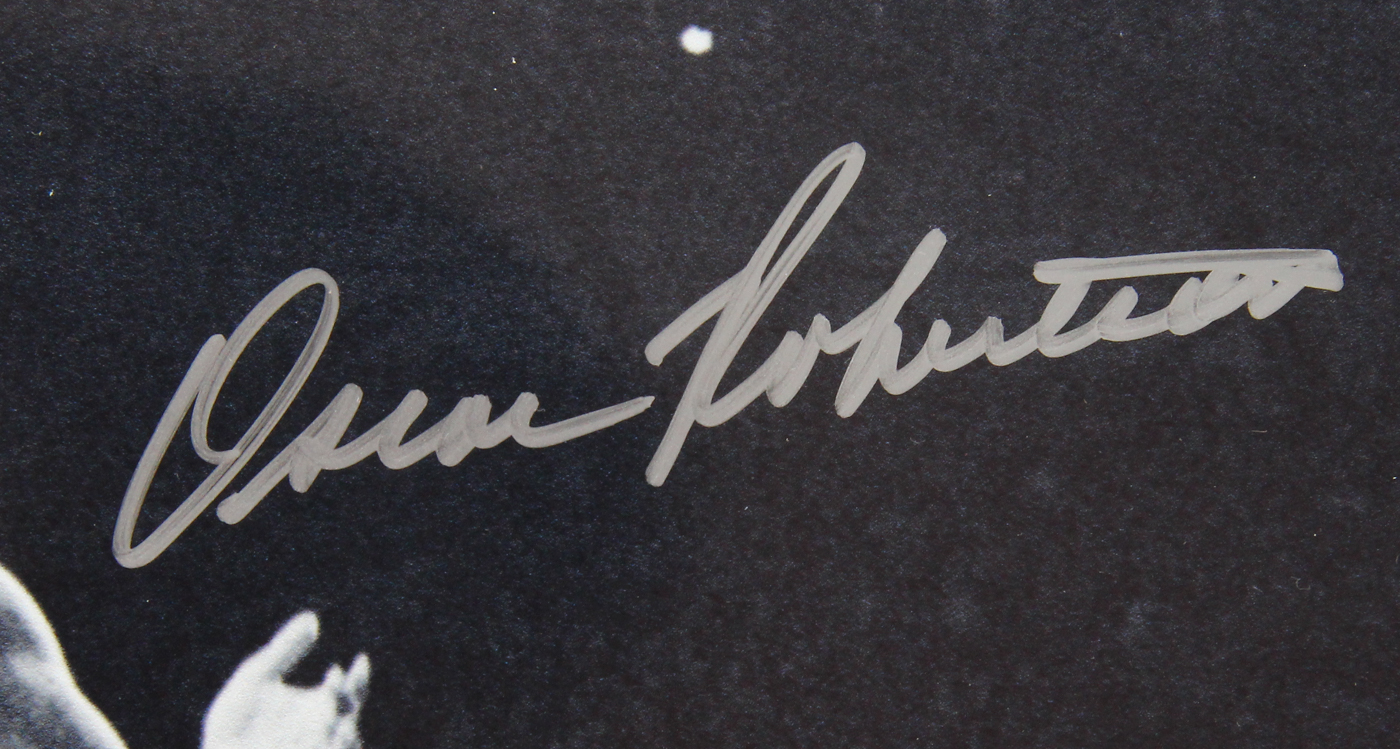 Photo measures 16" x 20" in size and has been hand-signed in silver paint pen by Oscar Robertson (HOF) and Jerry West (HOF).