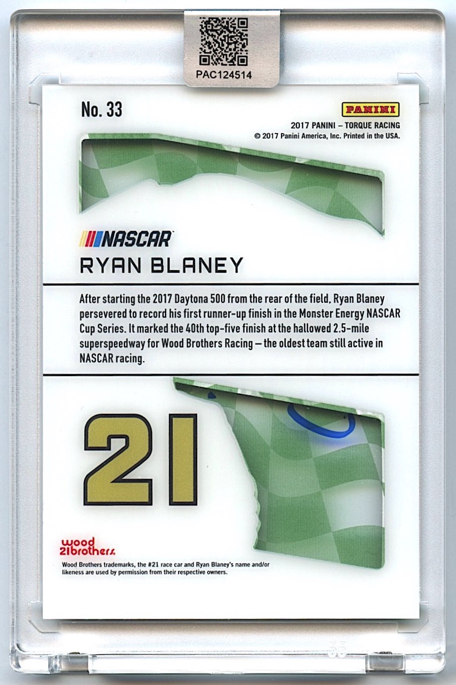Ryan Blaney Signed 2017 Panini Torque Clear Vision #33 Green #18/25 (PA Encapsulated)
