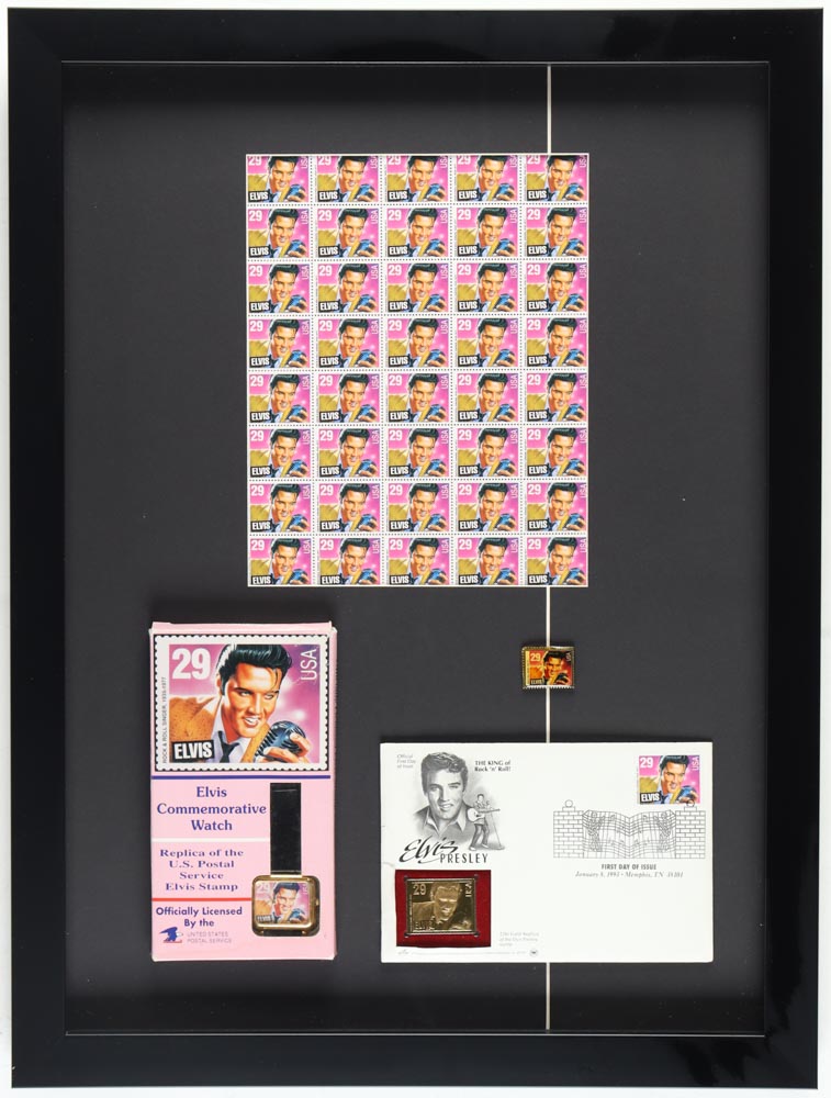 Elvis Presley Custom Framed Uncut Stamp Sheet Display With Stamp Release Pin, First Day Of Issue Envelope & Watch