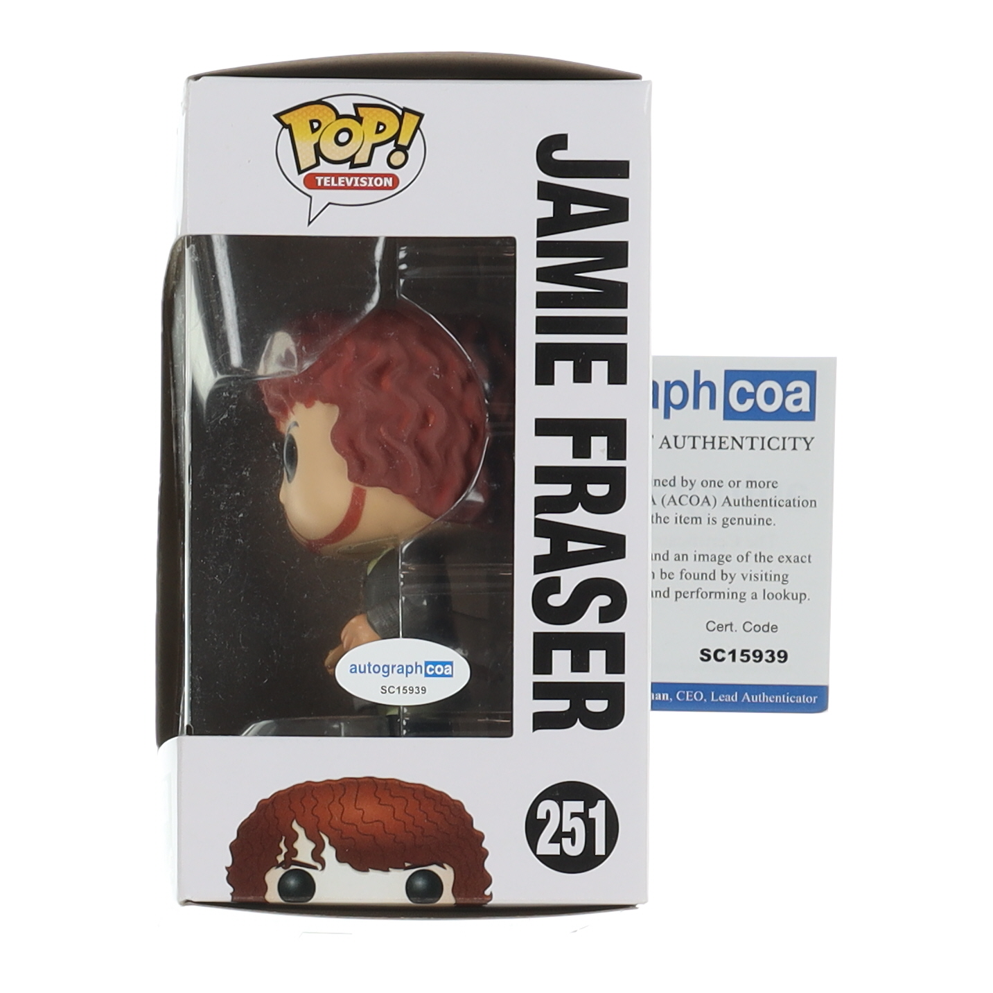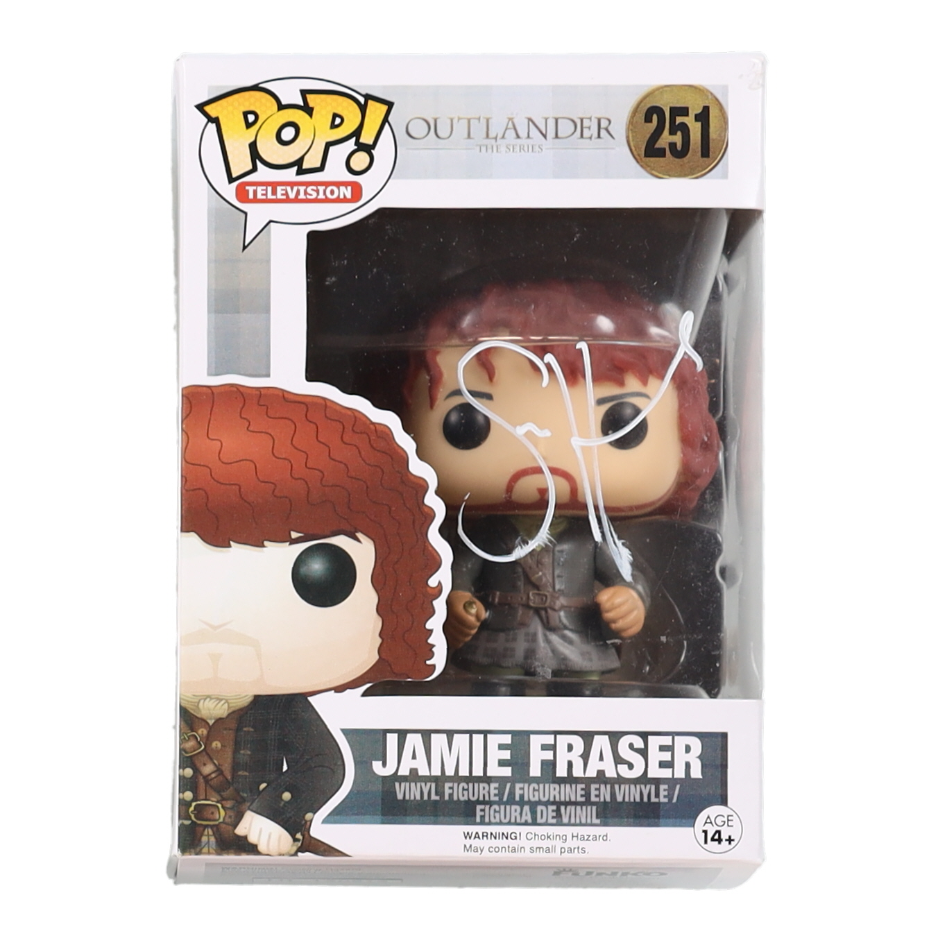 Funko Pop! vinyl figure measures approximately 4" in height. Hand-signed on the packaging by Sam Heughan. Please note, the window has been swapped.