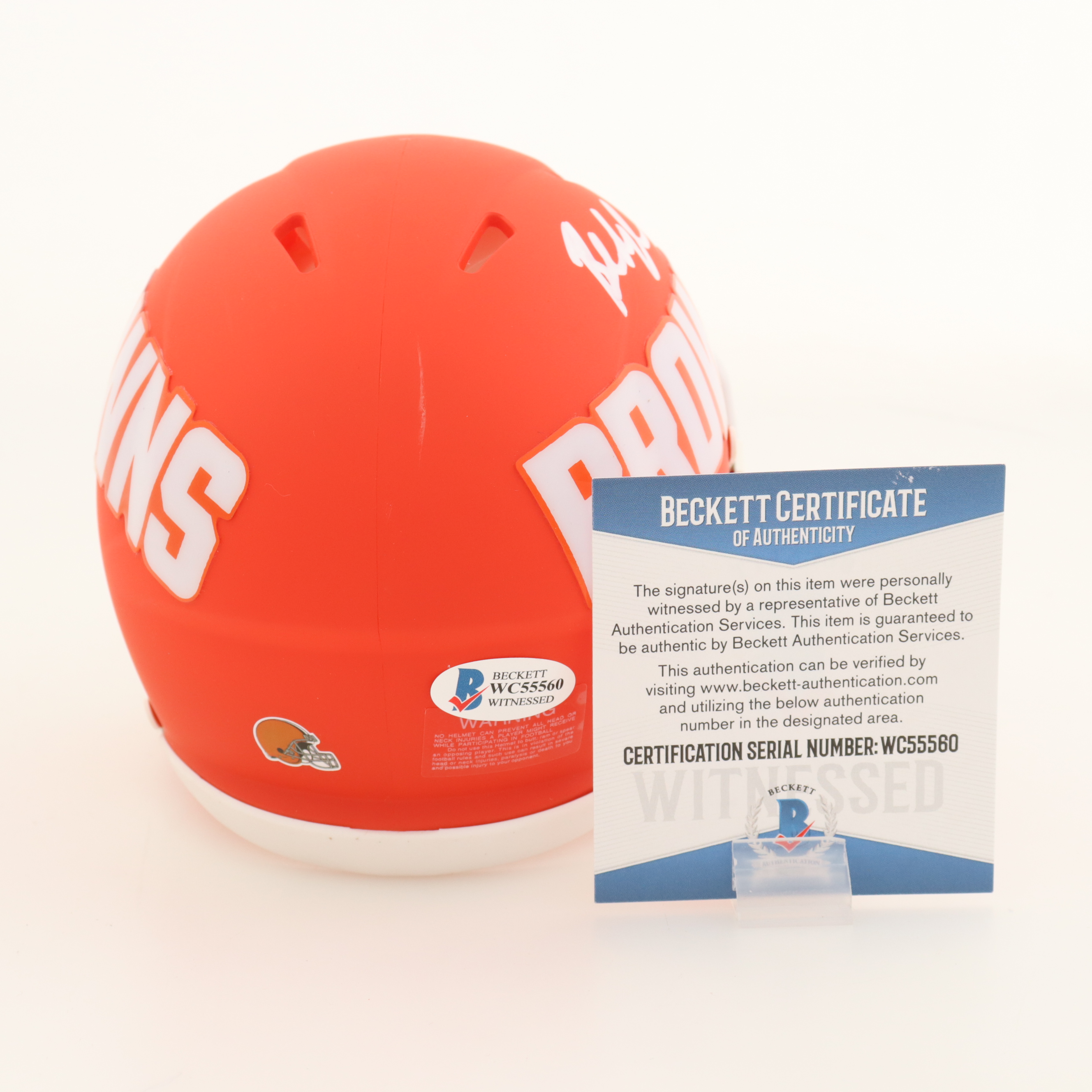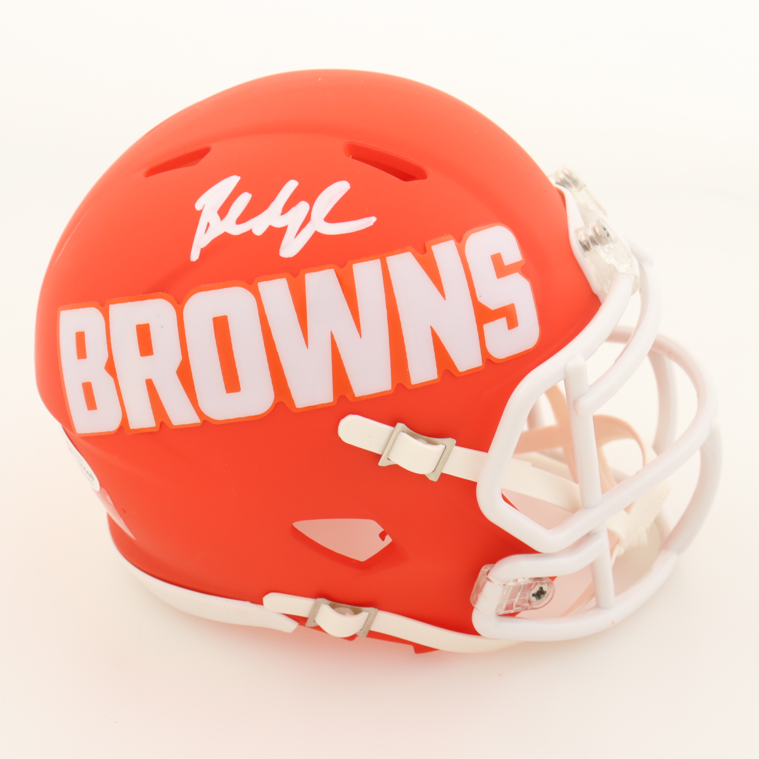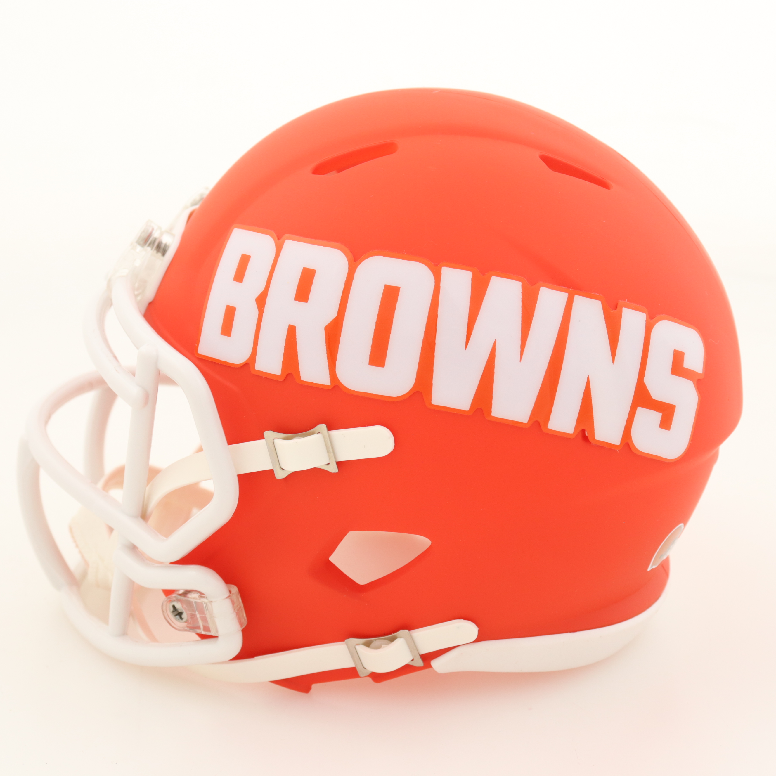 Riddell Cleveland Browns AMP alternate speed mini helmet. Hand-signed by Baker Mayfield.