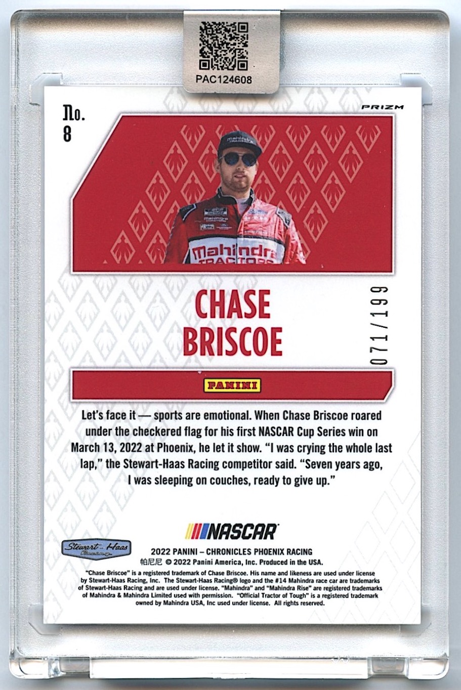 Chase Briscoe Signed 2022 Panini Chronicles Phoenix #8 Blue #071/199 (PA Encapsulated)