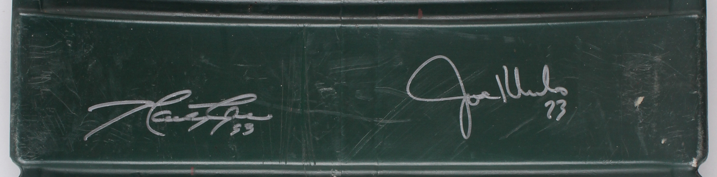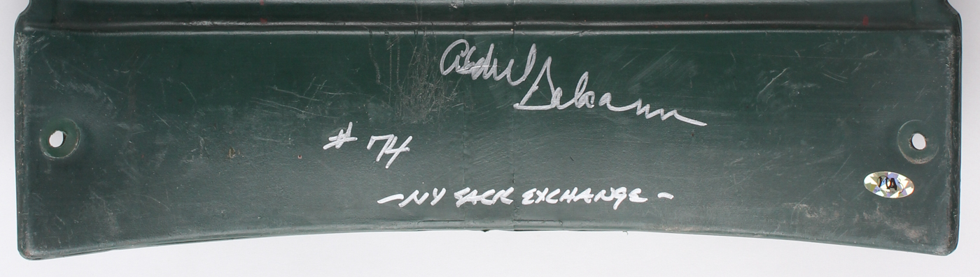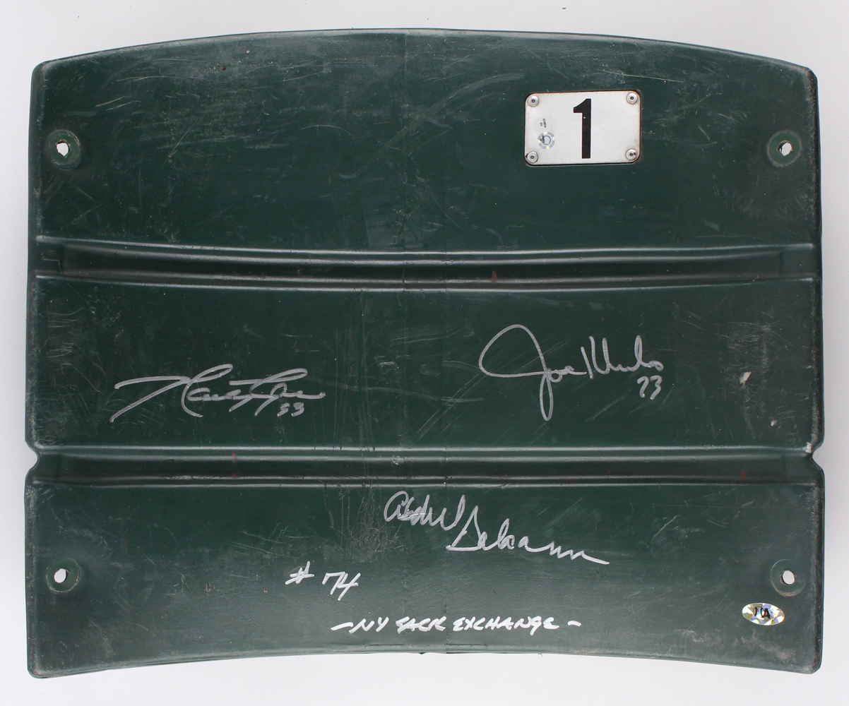 New York Jets Shea Stadium Game-Used Seat Back has been hand signed in silver paint pen by Joe Klecko, Marty Lyons and Abdul Salaam. See photos for details regarding the condition of the seat back.