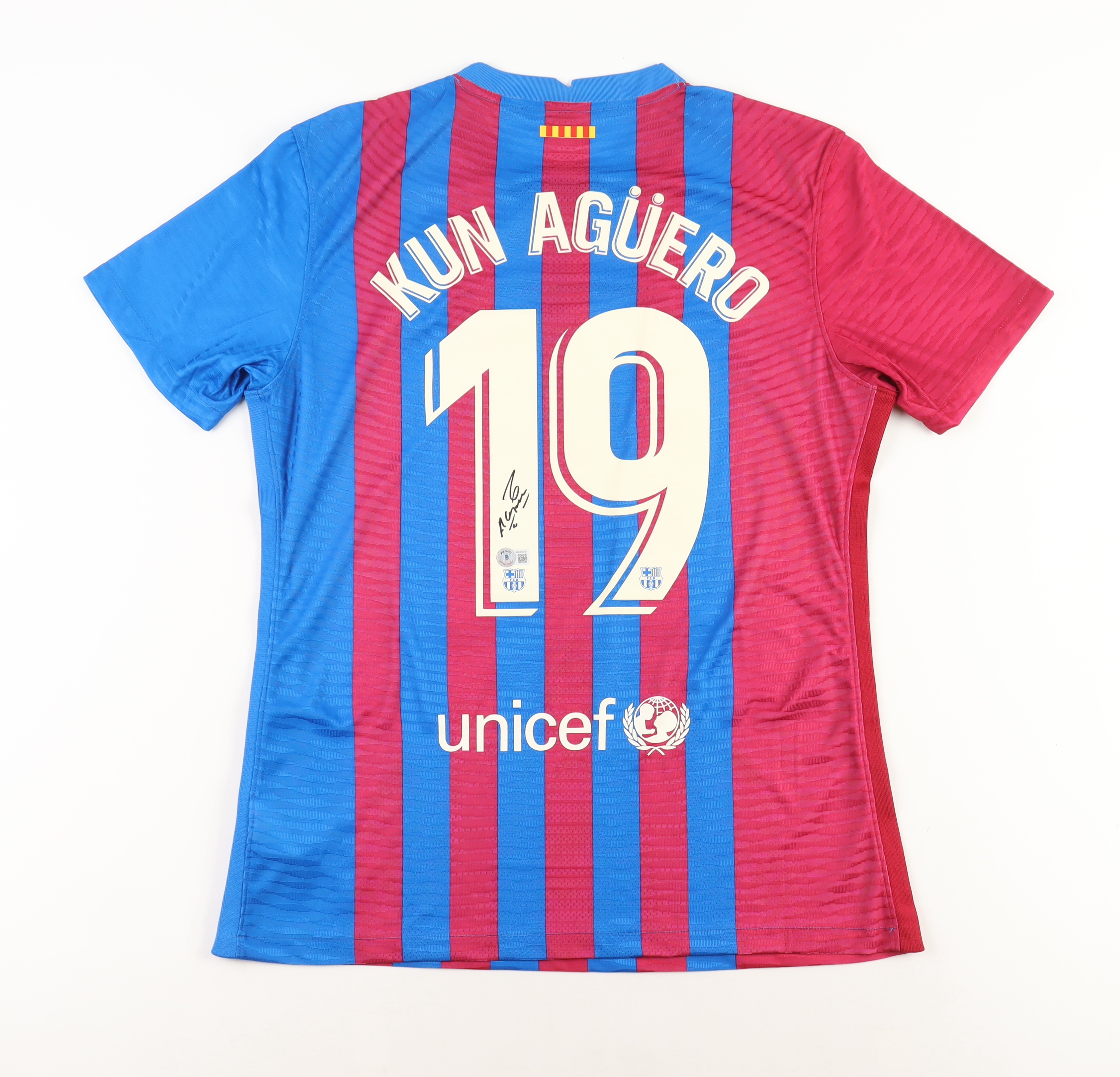 Custom soccer jersey. Everything sewn on, size XL. Hand-signed by Sergio Aguero.