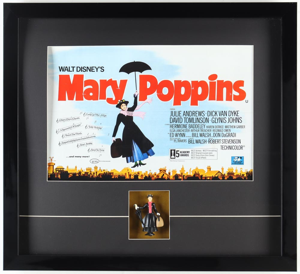 Custom framed display measures approximately 21" x 23" in size. Features a "Mary Poppins" poster print and character figurine. Please note, the display is unsigned.