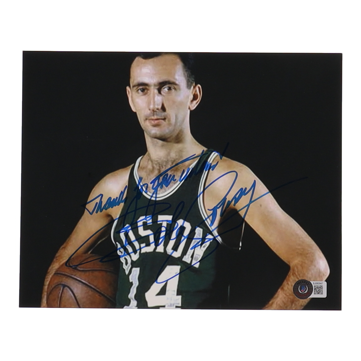 Photo measures 8" x 10" in size and has been hand-signed and inscribed by Bob Cousy (Boston Celtics, HOF).