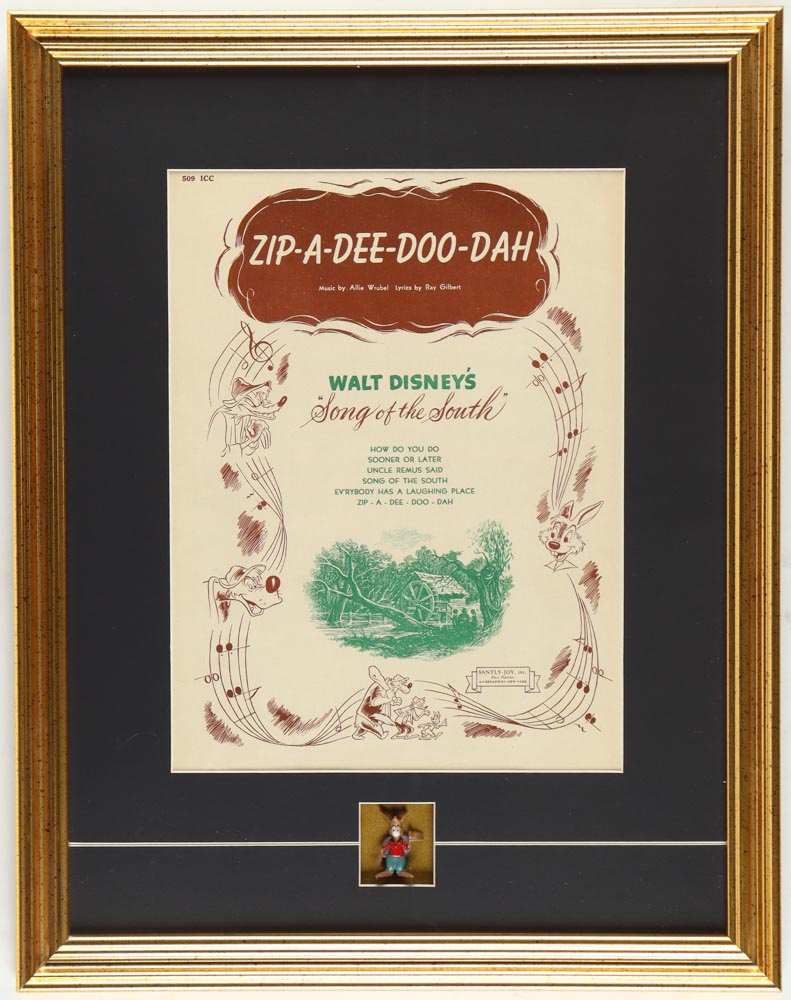 Custom frame measures approximately 15" x 19" in size and features a sheet of vintage 1946 song list for "Zip-A-Dee-Doo-Dah" and also includes a retired B'Rer Rabbit figure. Please note, the display is unsigned.