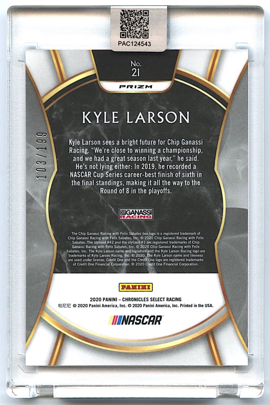 Kyle Larson Signed 2020 Select #21 Blue #103/199 (PA Encapsulated)