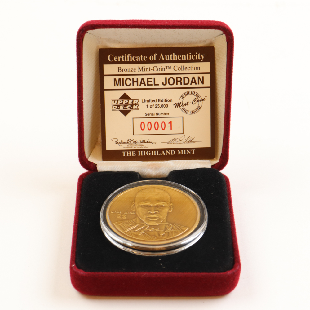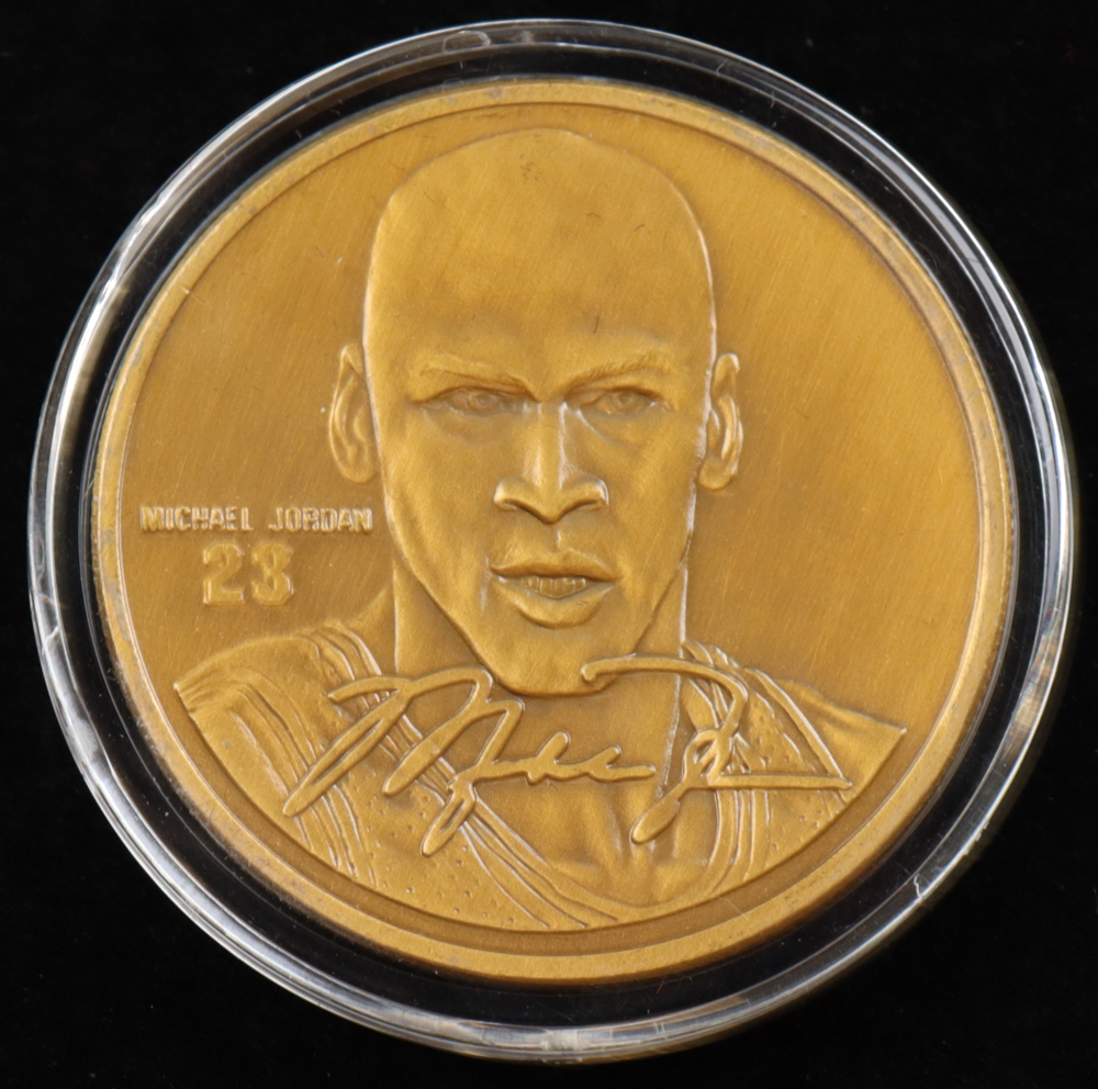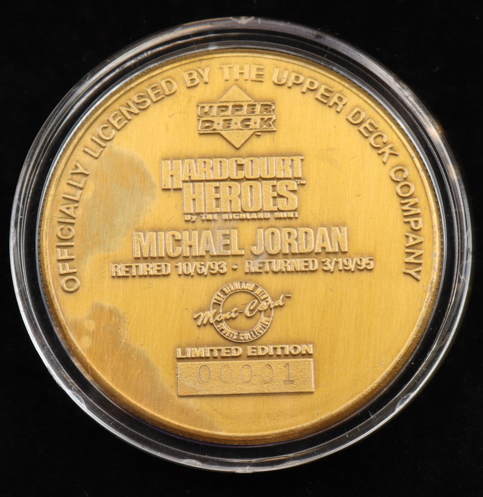 1995 Upper Deck Hardcourt Heroes bronze medallion featuring Michael Jordan (Chicago Bulls, HOF). This coin is Limited Edition and has been numbered #1/25,000. Please see photos for more details on the condition of the round.