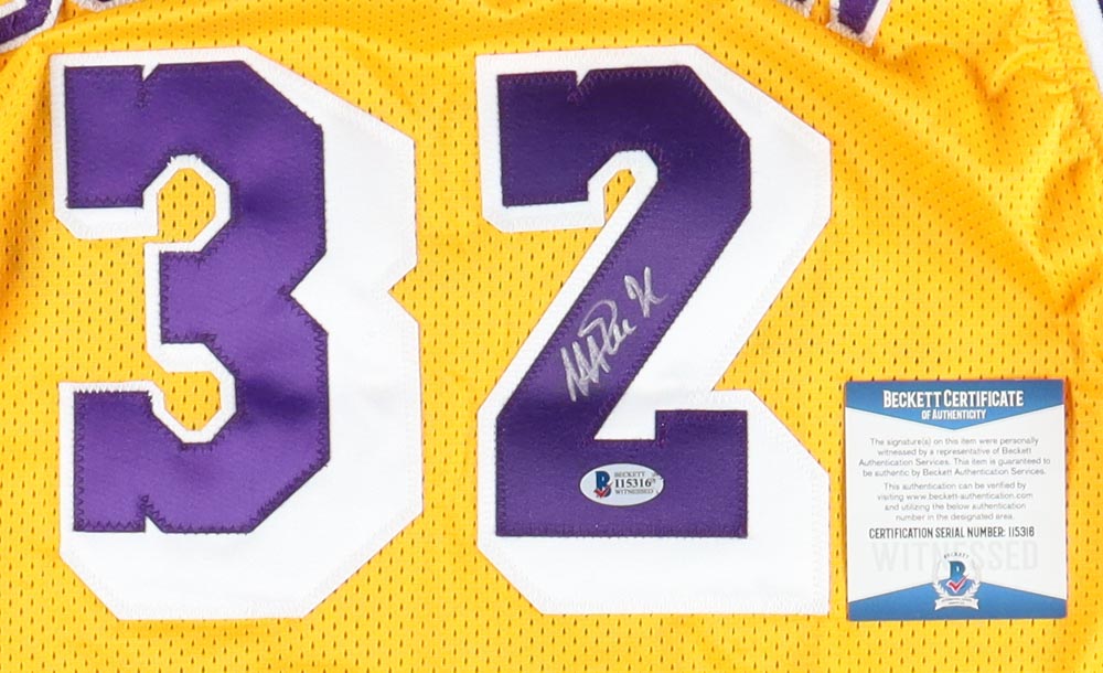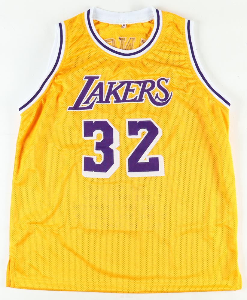 Custom on-court style jersey. Everything sewn on, size XL. Hand-signed by Magic Johnson (HOF). Johnson's career highlights have been custom stitched onto the back of the jersey below the reverse numbers.