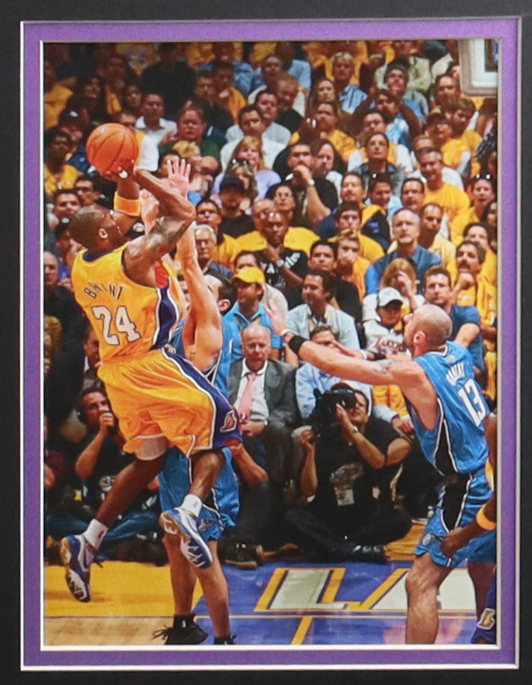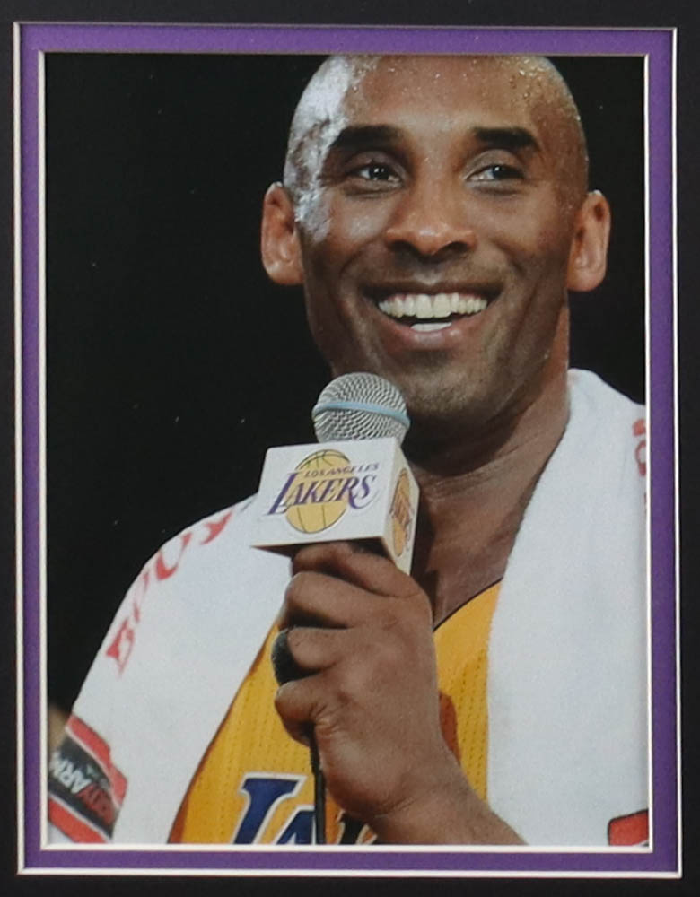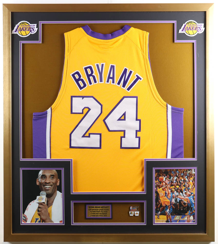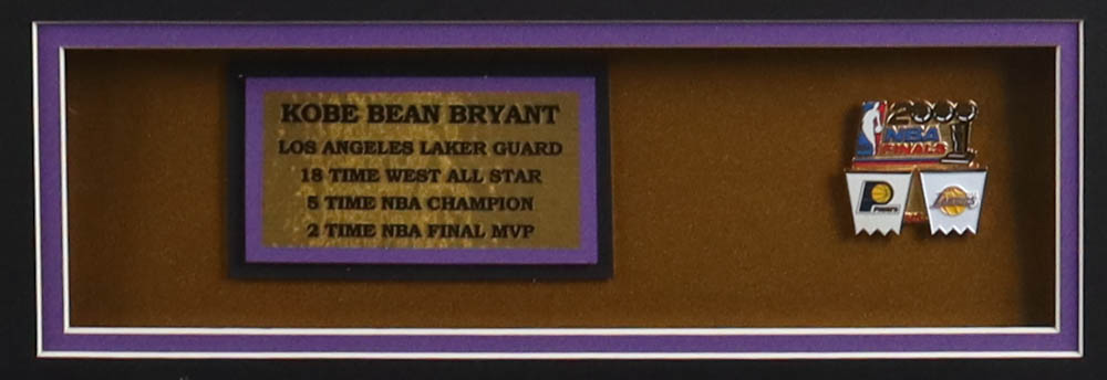 Custom frame measures 32" x 36" in size and features an unsigned on-court style Kobe Bryant (D. 2020, HOF) jersey. The display also includes 2000 NBA Finals pin, (2) team logo patches as well as (2) photos. Please note, the display is unsigned.
