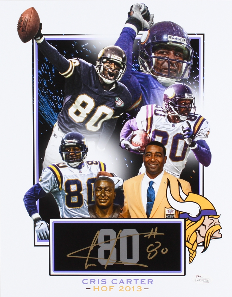 Photo measures 11" x 14" in size and has been hand-signed in gold paint pen by Cris Carter (HOF).