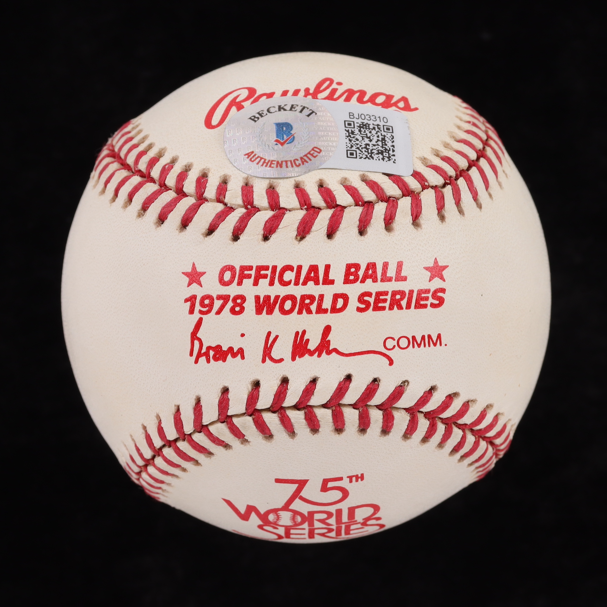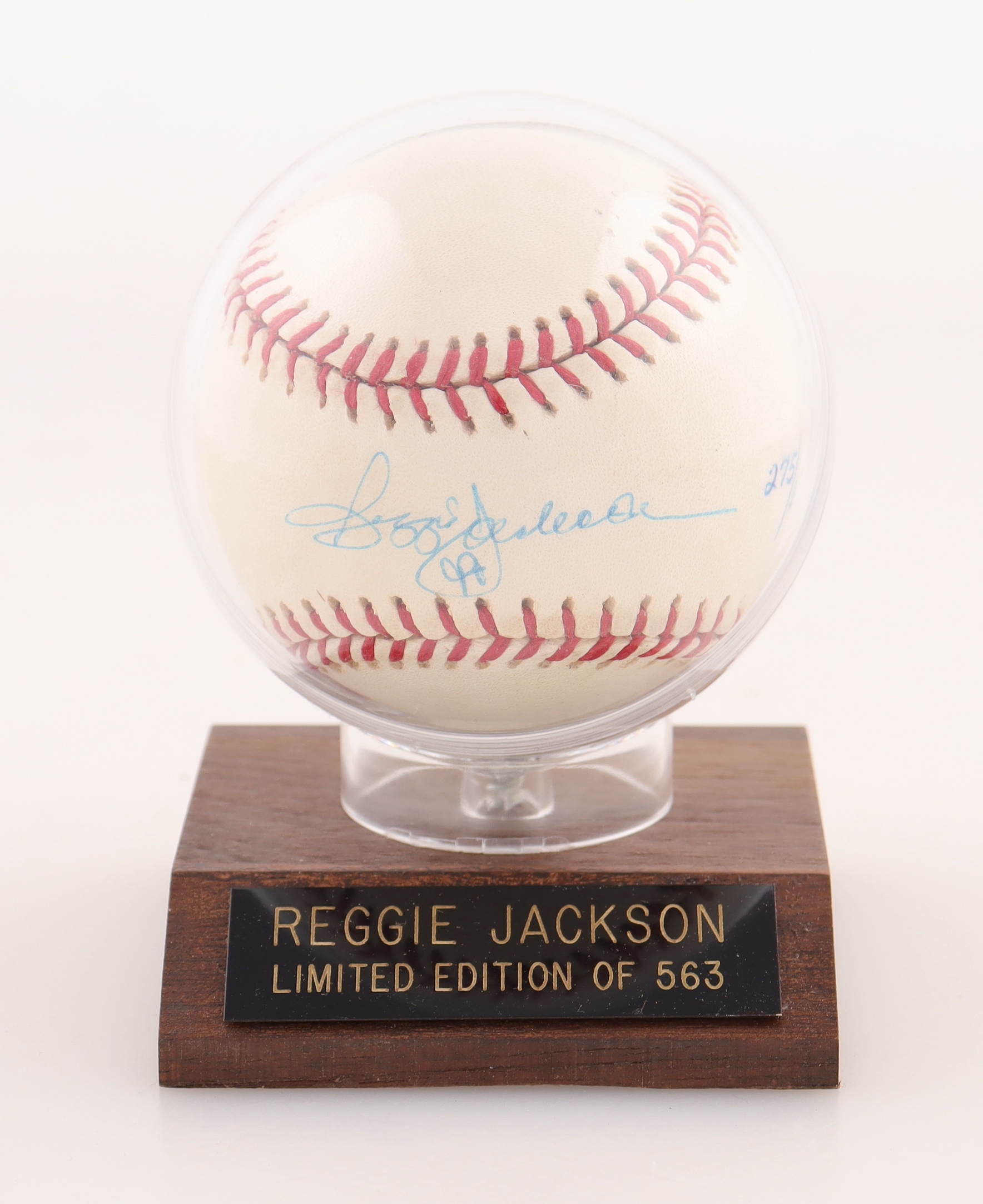 Rawlings Official 1978 World Series baseball. Hand-signed by Reggie Jackson (New York Yankees, HOF). The baseball is limited edition and has been numbered #275/563. The display stand is included as shown.