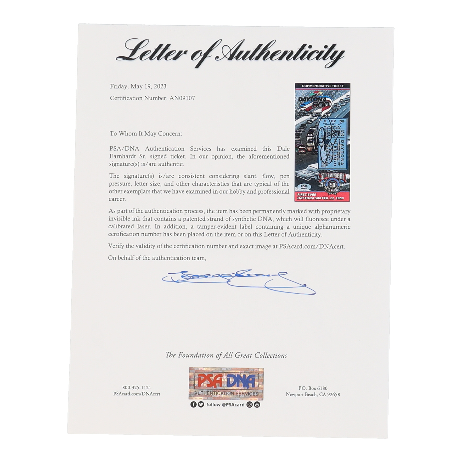 Ticket measures 4" x 8.5" in size and has been hand-signed by Dale Earnhardt Sr. (D. 2001, HOF).