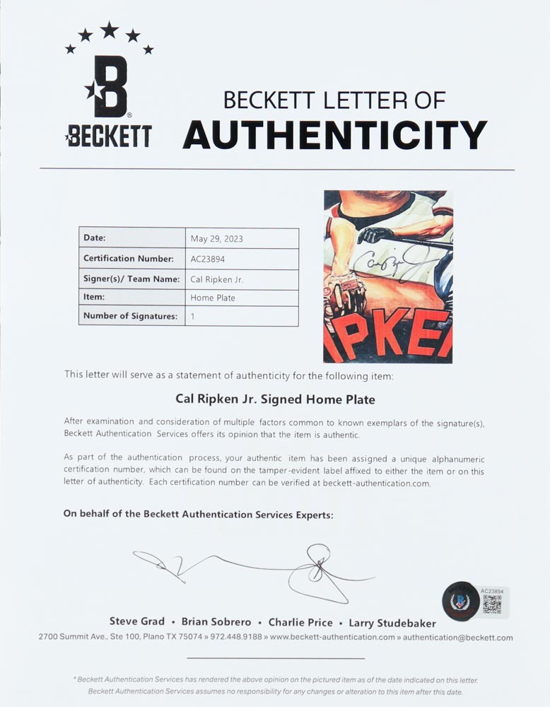 Cal Ripken Jr. Signed Orioles Commemorative Home Base (Beckett)