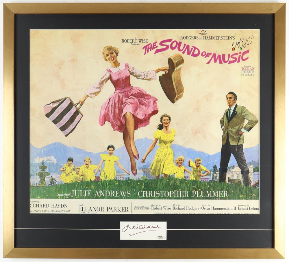 Custom frame measures 29" x 32" in size and features a cut that has been hand-signed by Julie Andrews. Display also features a "Sound of Music" poster.