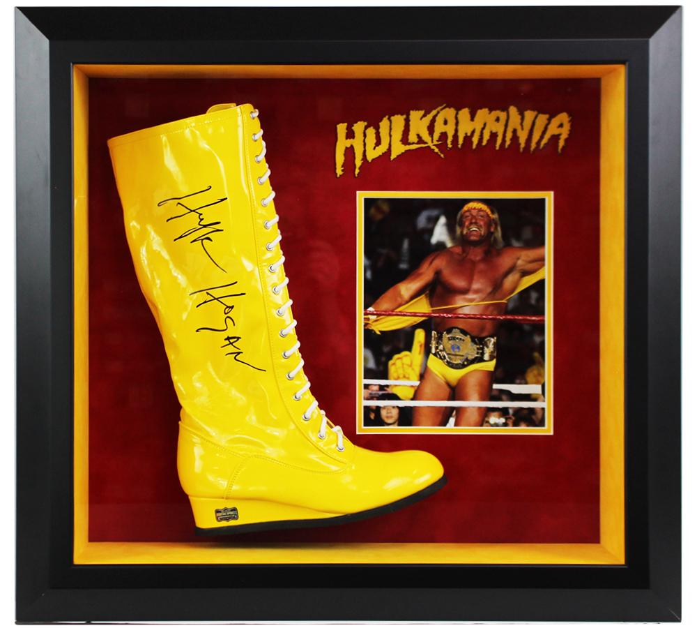 Custom frame measures 26" x 24" with a depth of 6". Features a boot that has been hand-signed by Hulk Hogan (HOF).
