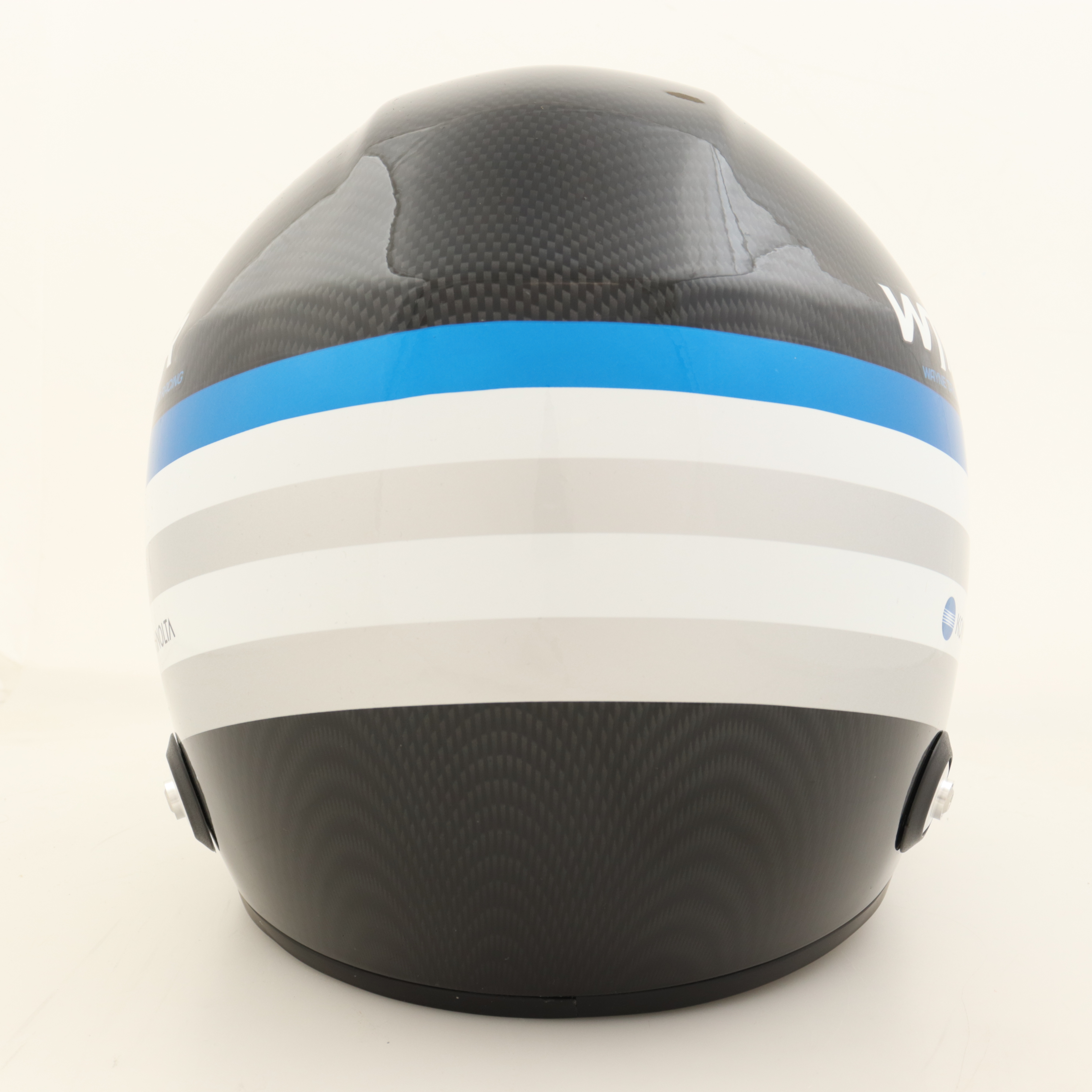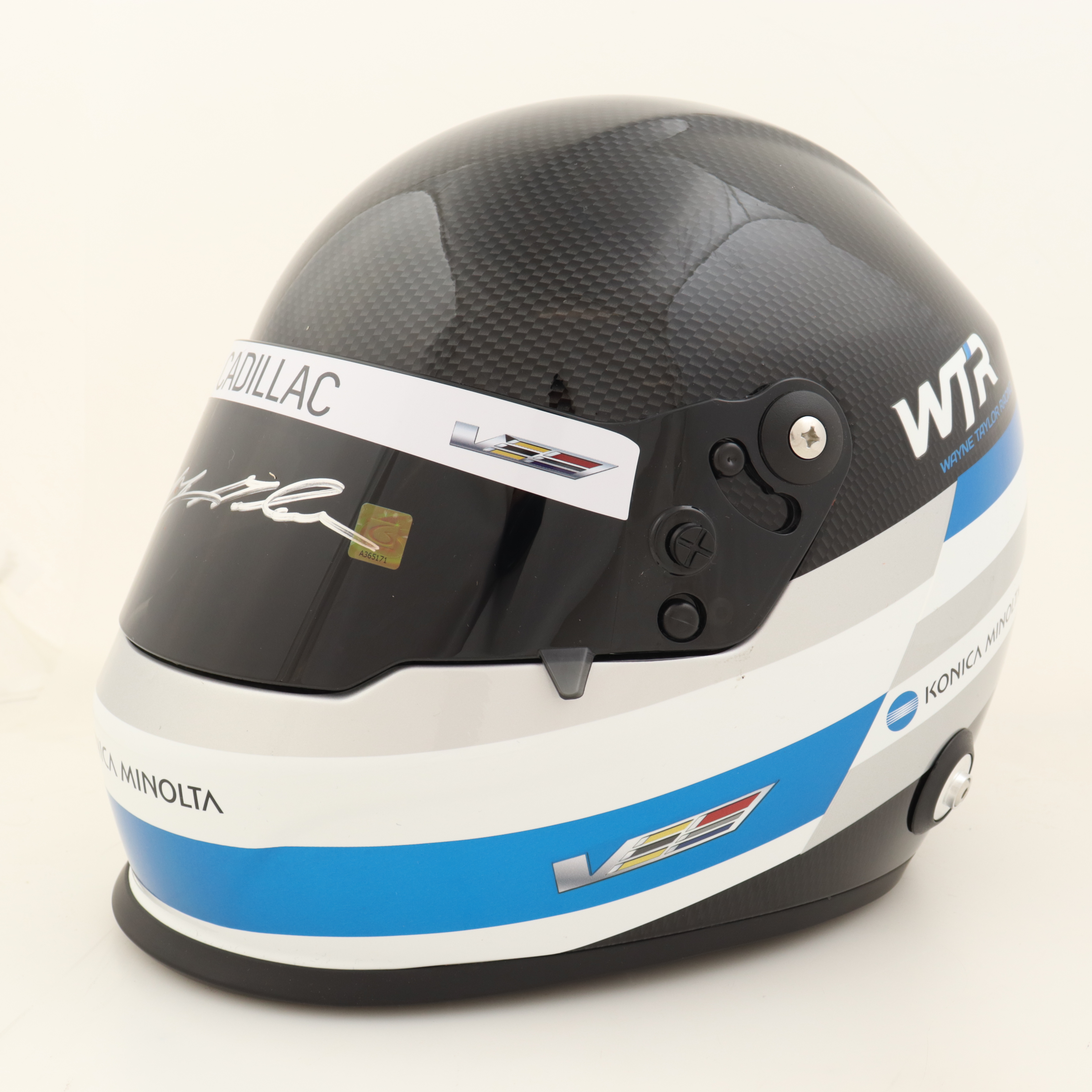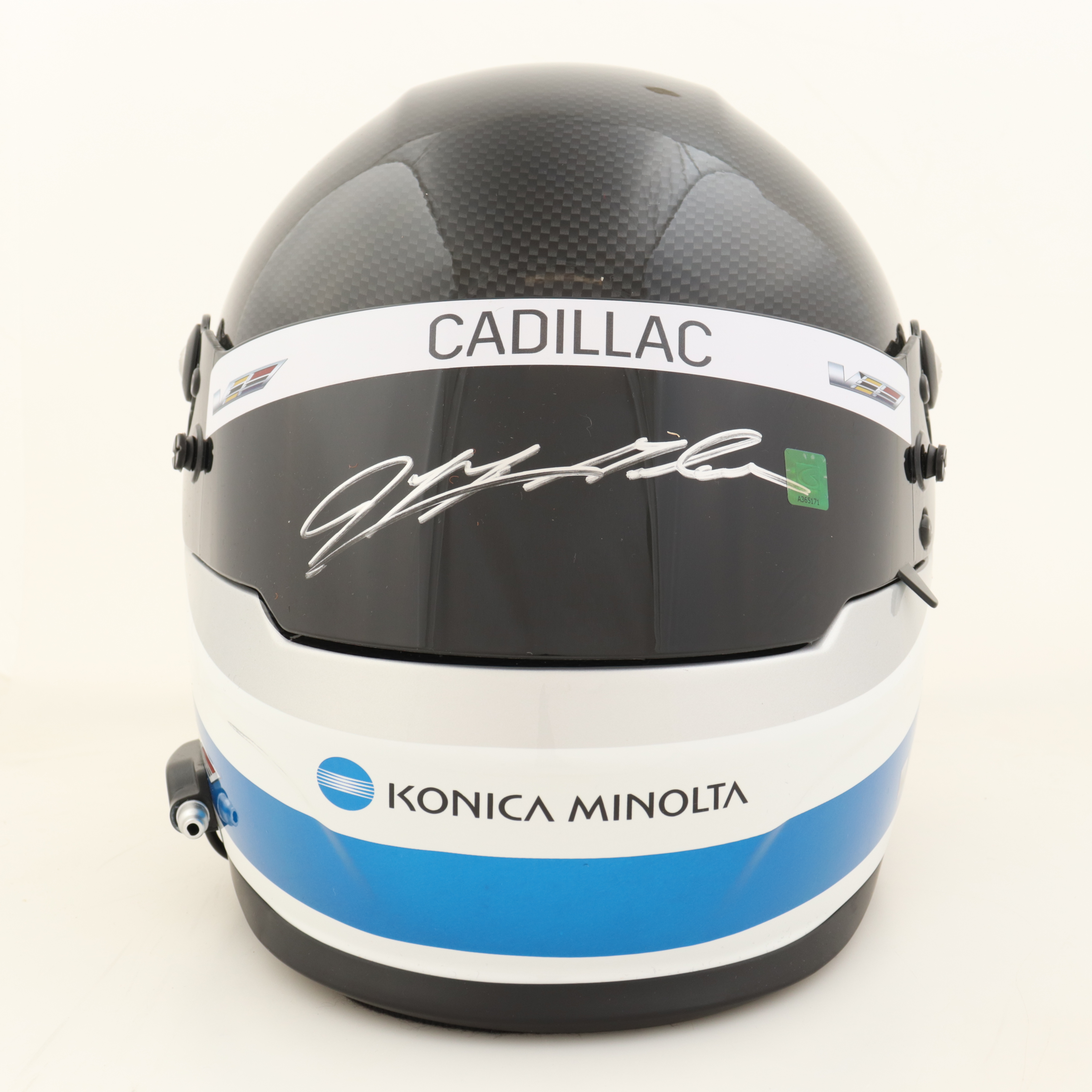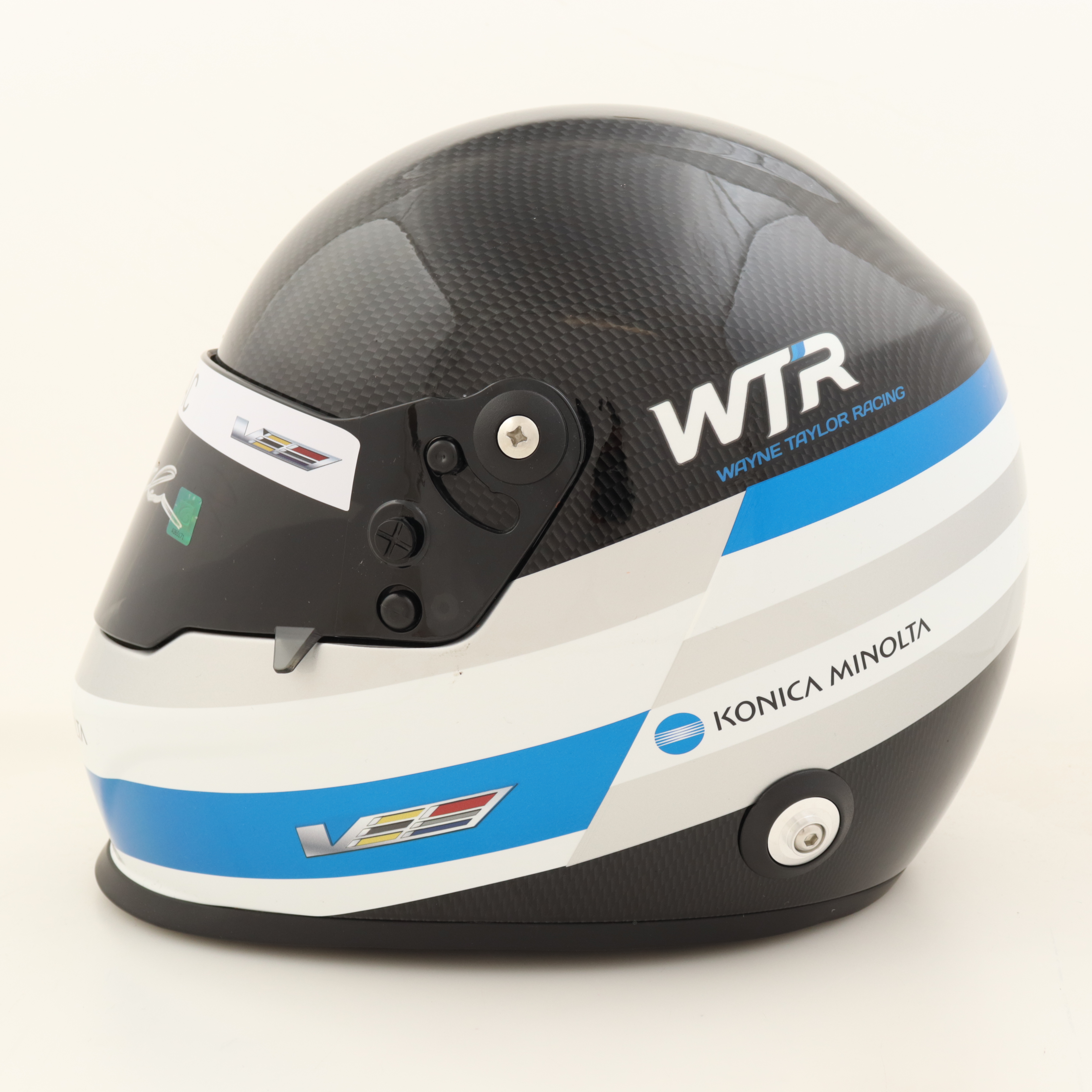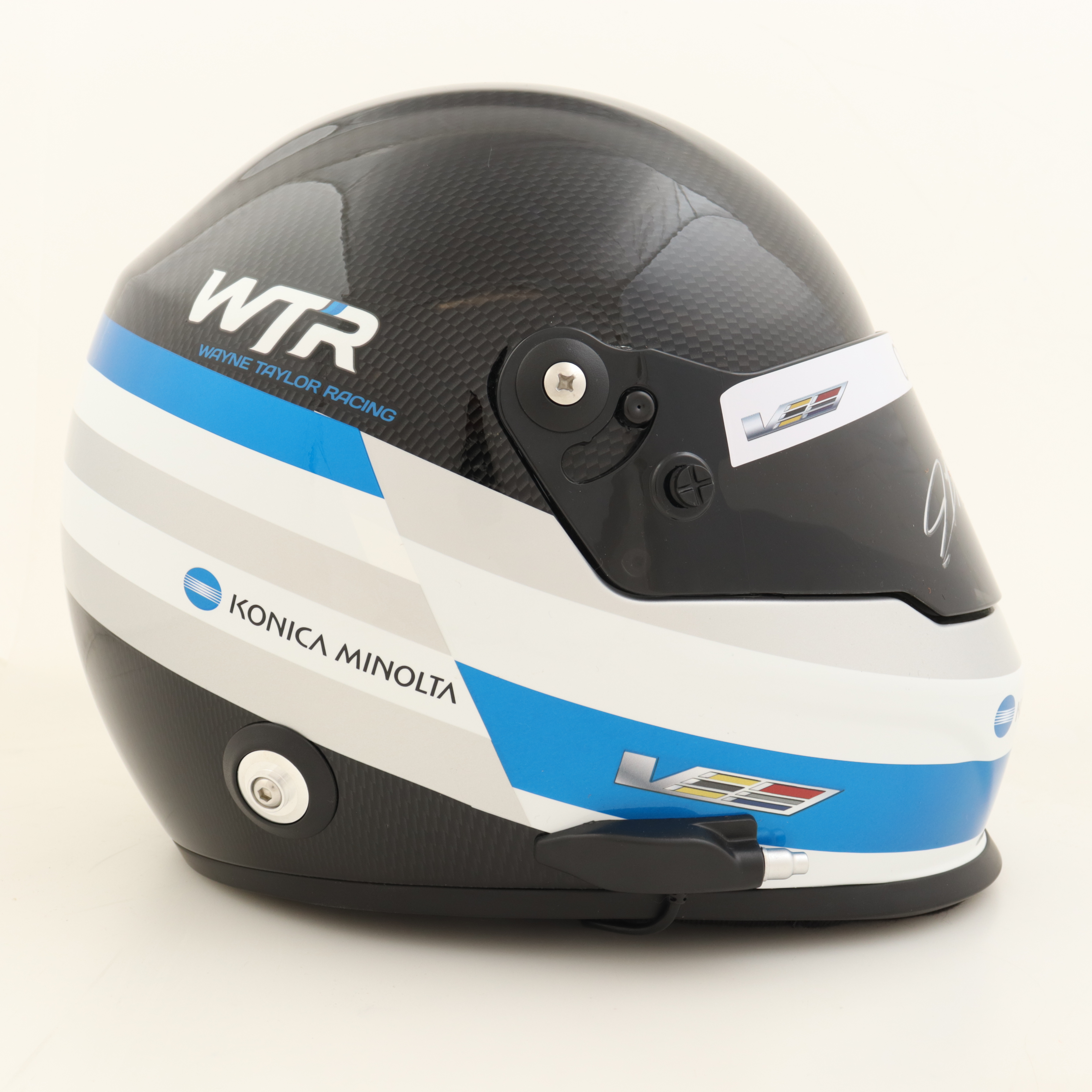 Full-size replica NASCAR helmet is hand-signed on the visor by Jeff Gordon. The helmet mirrors Gordon's 2017 Wayne Taylor Racing Konica Minolta helmet worn for his 24 Hours of Daytona win.