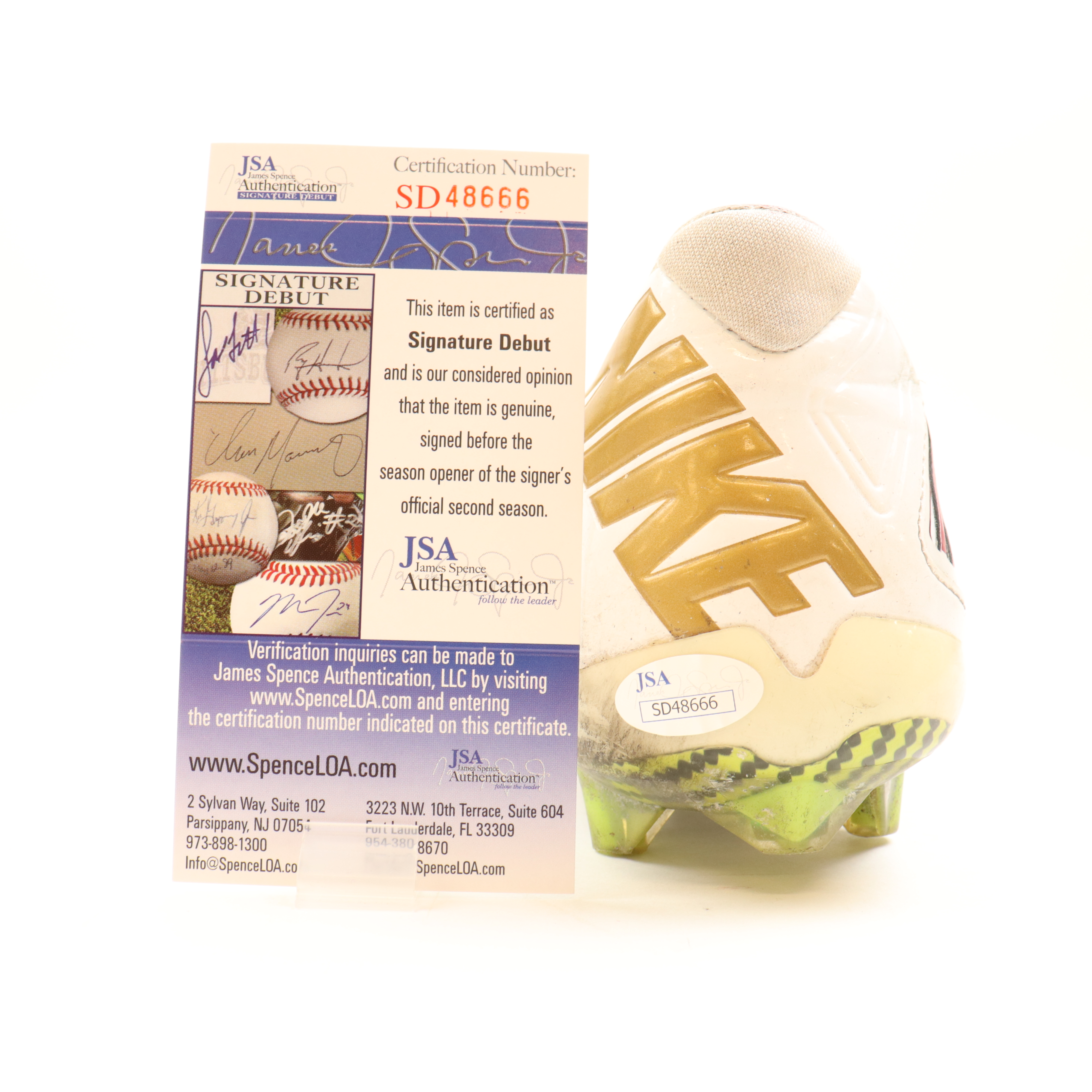 The autograph(s) includes an official James Spence Authentication (JSA) "Signature Debut" hologram and COA. "Signature Debut" is the autographed memorabilia equivalent to a rookie card. The JSA definition of a "Signature Debut" is as follows: "Any item that is autographed and received by JSA prior to the last game of the signer's official rookie season.