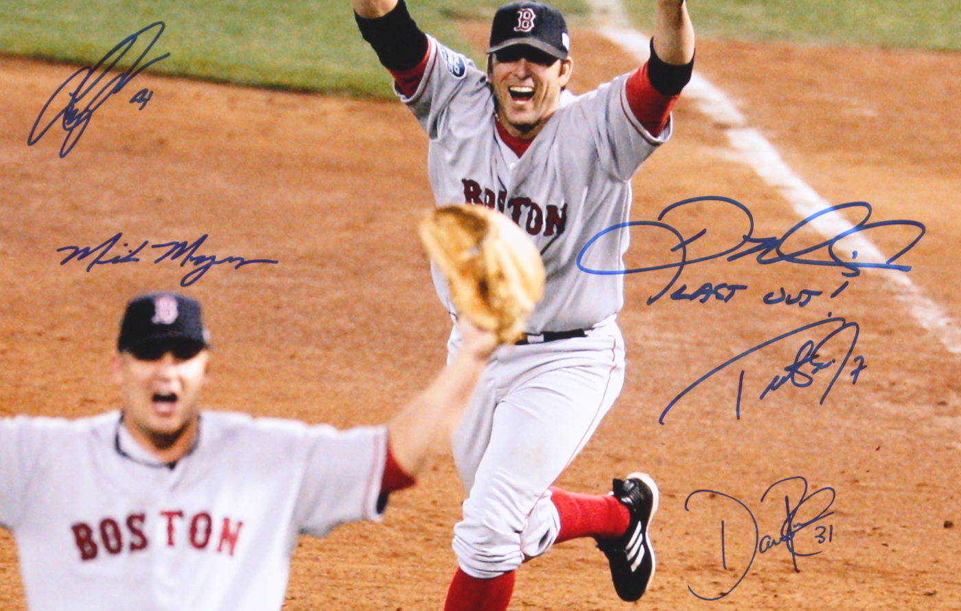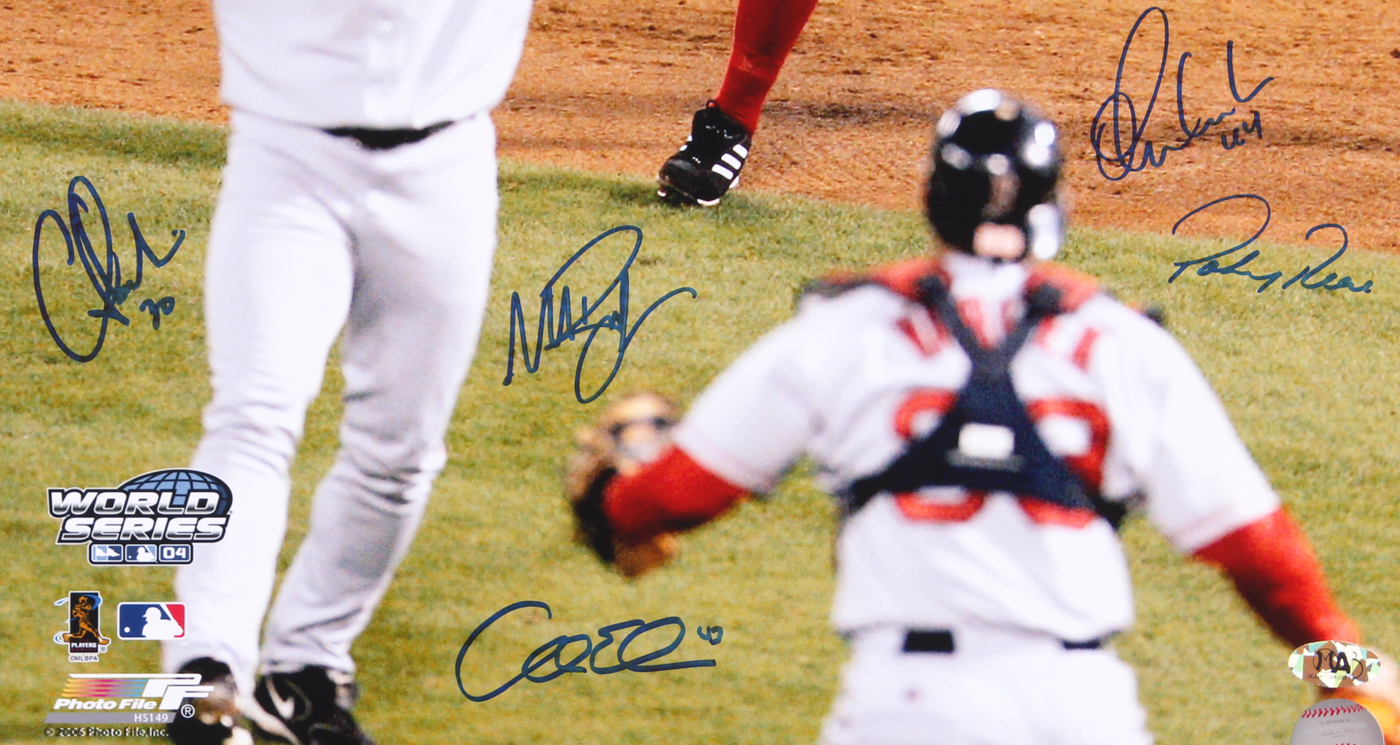 Photo measures 16" x 20" and has been hand signed in blue felt-tip pen by (10) members of the 2004 Boston Red Sox including Dave Roberts, Trot Nixon, Pokey Reese, Cesar Crespo, Mike Myers, Curt Leskanic, and others.
