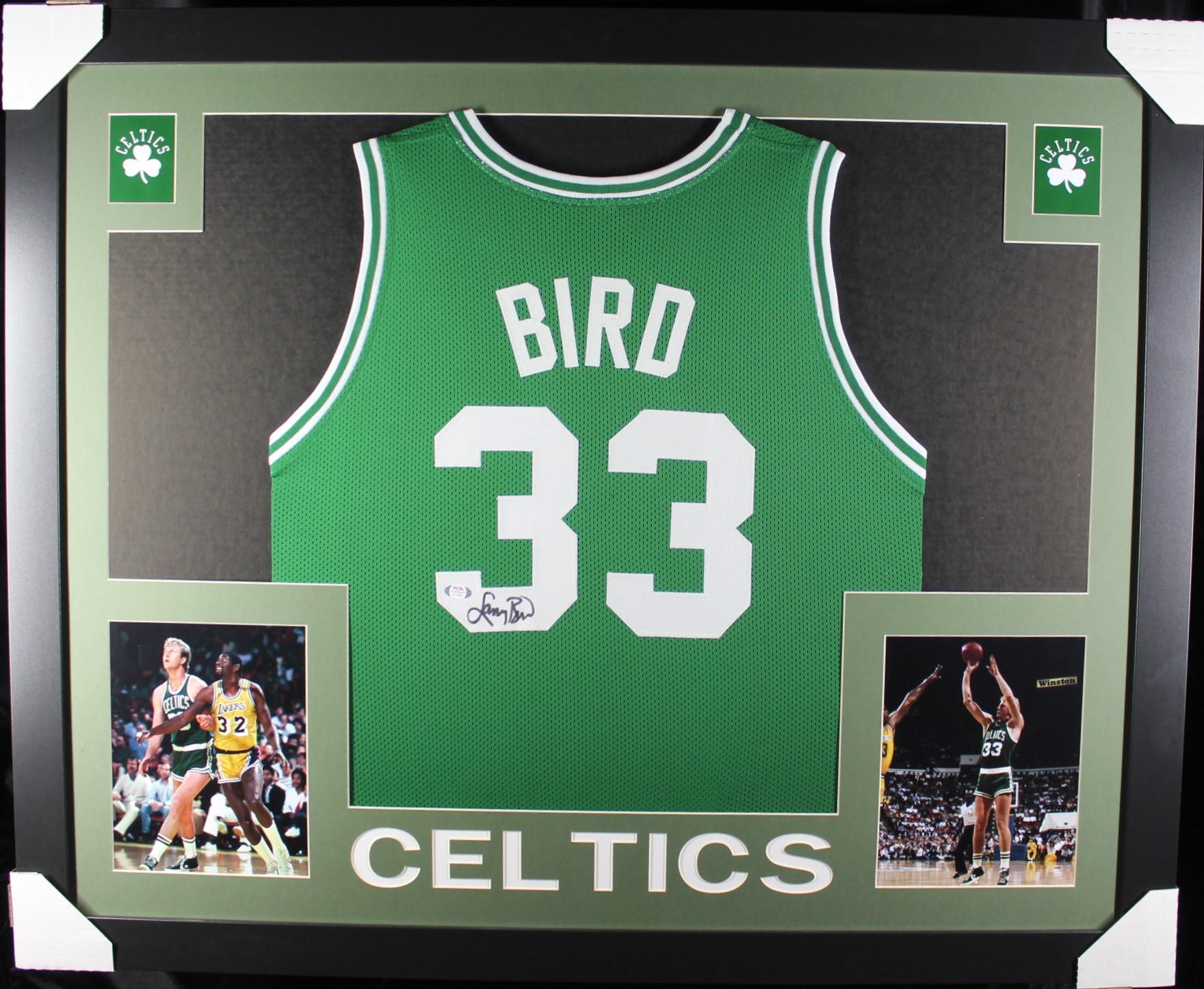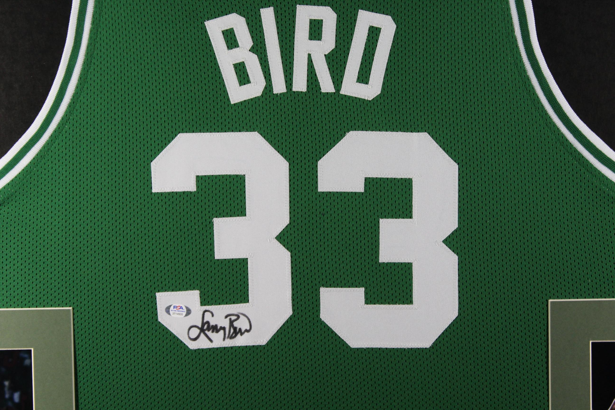 Custom frame measures approximately 35" x 43" in size and features a jersey hand-signed by Larry Bird (HOF).