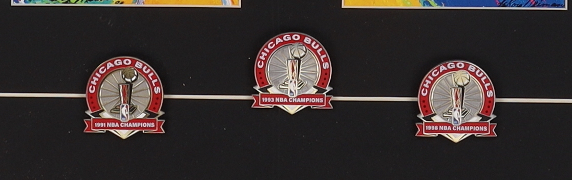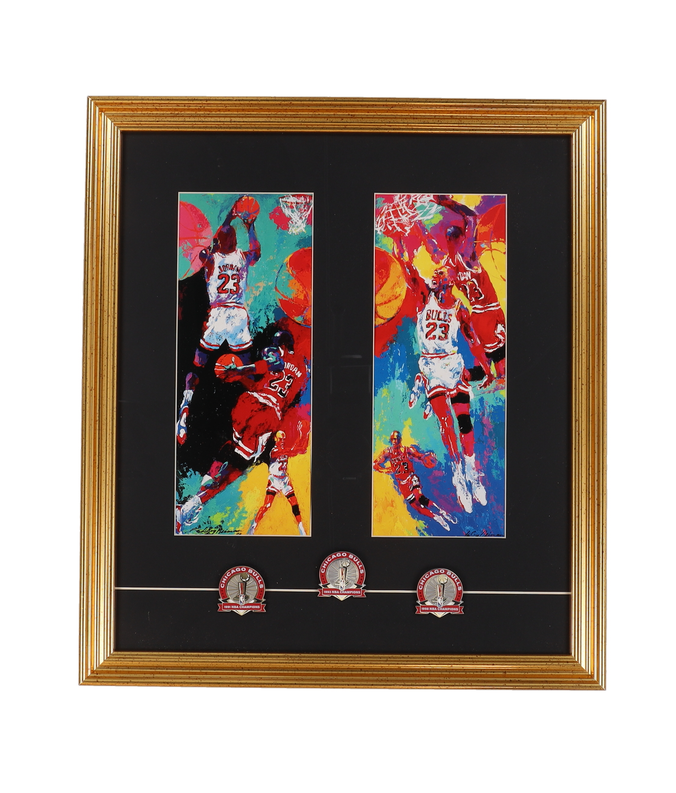 Custom framed display measures 16 x 18" in size and features Leroy Neiman prints of Michael Jordan (Chicago Bulls, HOF). The display also includes (3) Chicago Bulls Championship pins. Please note, the display is unsigned.