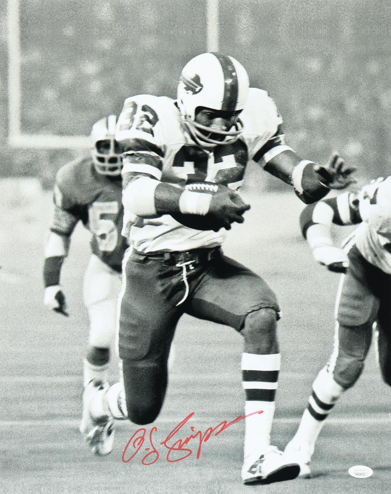 Photo measures 16" x 20" in size and has been hand-signed by O.J. Simpson (Buffalo Bills, HOF).