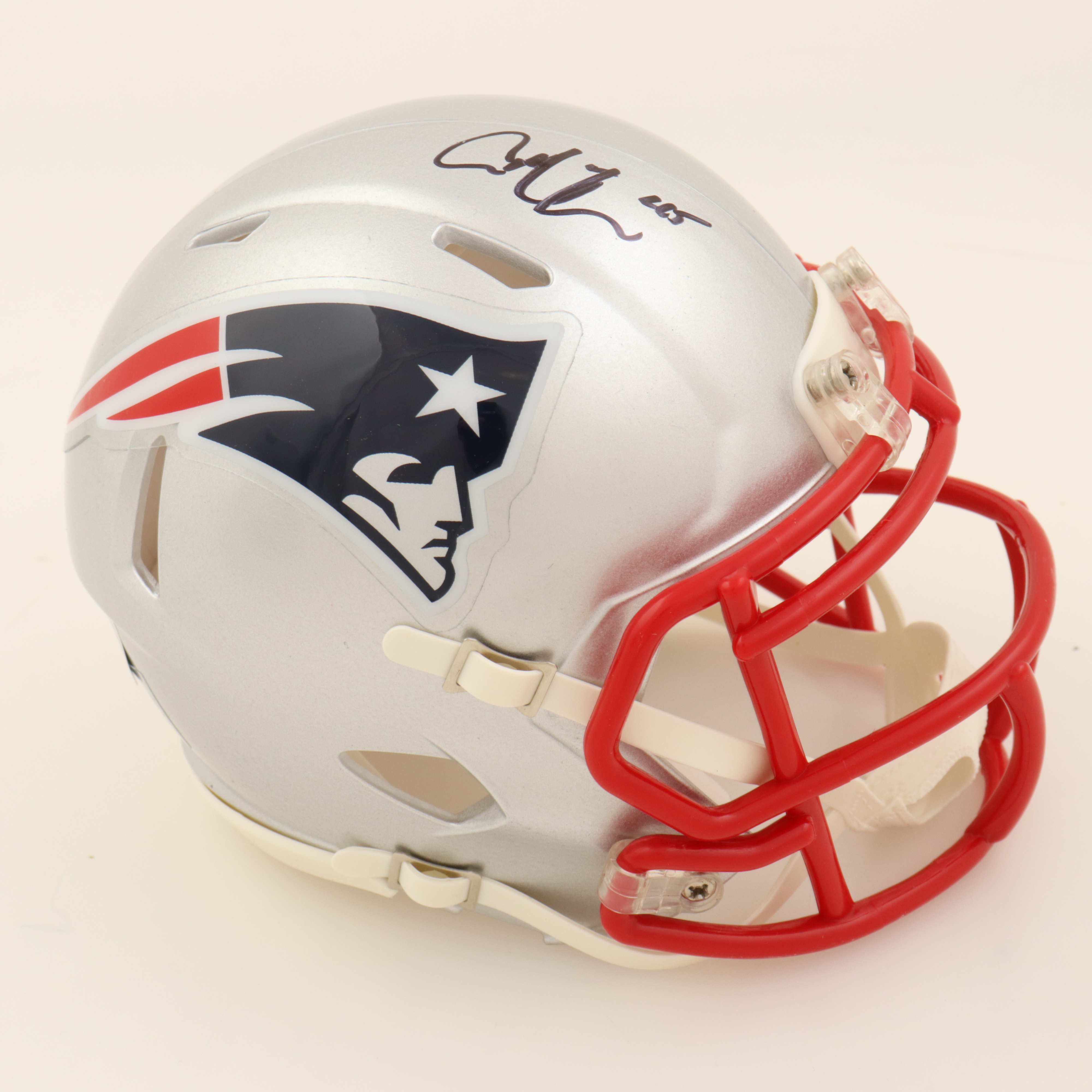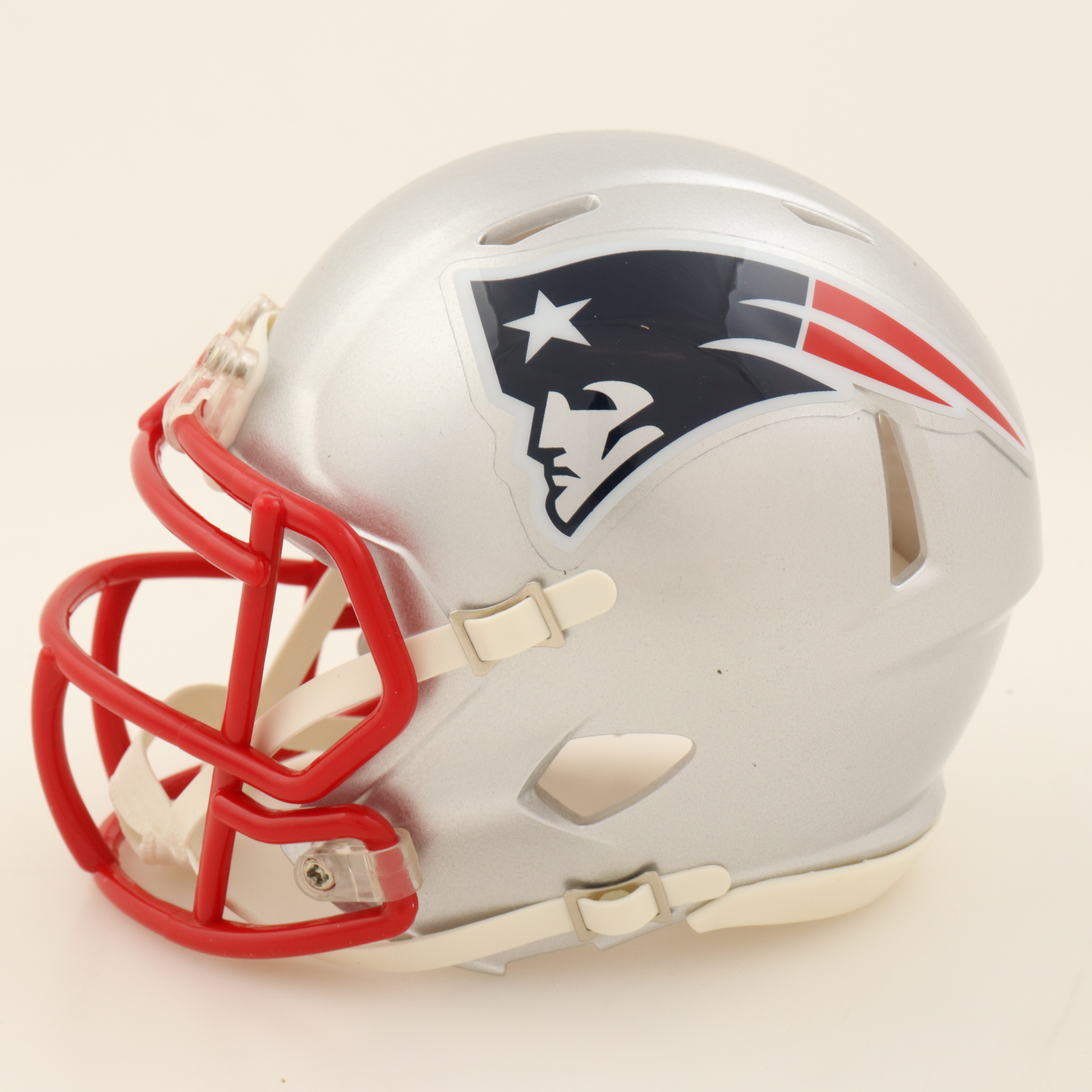 Riddell New England Patriots speed mini helmet. Has been hand-signed by Cameron McGrone.