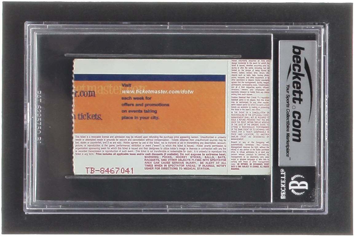 Ticket stub has been graded Beckett (BGS) 6. Please see photos for more details regarding the condition of the ticket. Please note, the ticket is not signed.