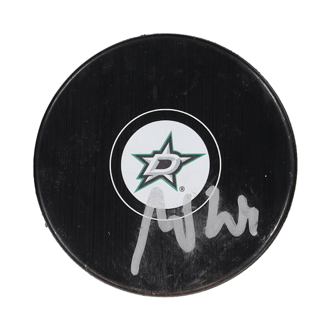 Dallas Stars logo hockey puck. Hand-signed by Miro Heiskanen (Dallas Stars).
