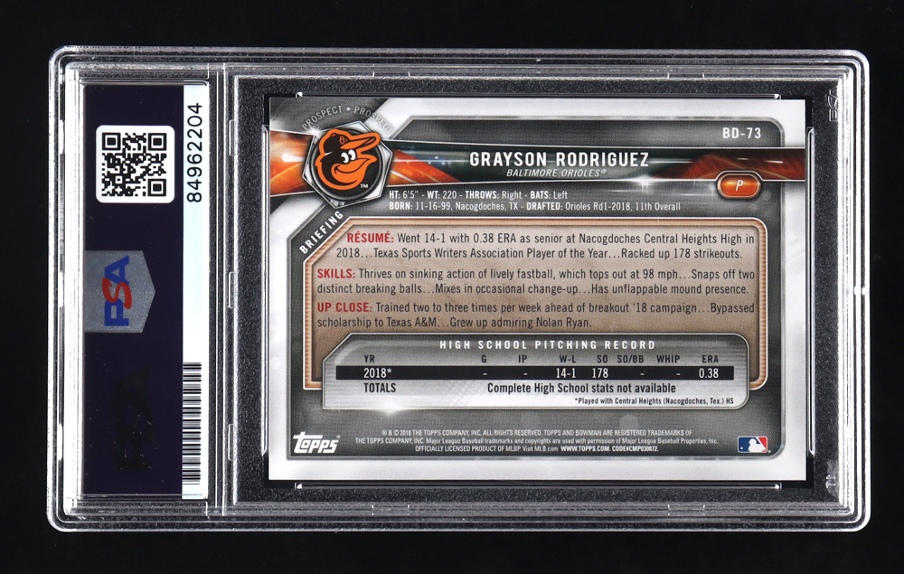 Grayson Rodriguez Signed 2018 Bowman Draft #BD-73 RC (PSA)