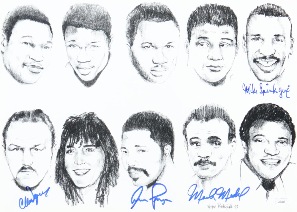 Boxing Caricature 10x14 Photo Signed By (4) with Chuck Wepner, Aaron Pryor, Michael Spinks & Mark Medal (JSA)