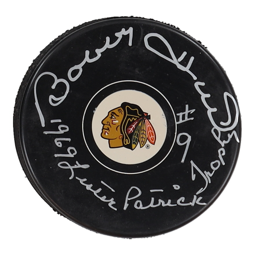 Bobby Hull Signed Blackhawks Logo Hockey Puck Inscribed "1969 Lester Patrick Trophy" (Schwartz)