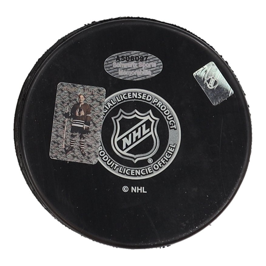 Chicago Blackhawks Logo hockey puck. Hand-signed and inscribed by Bobby Hull (D. 2023, HOF).