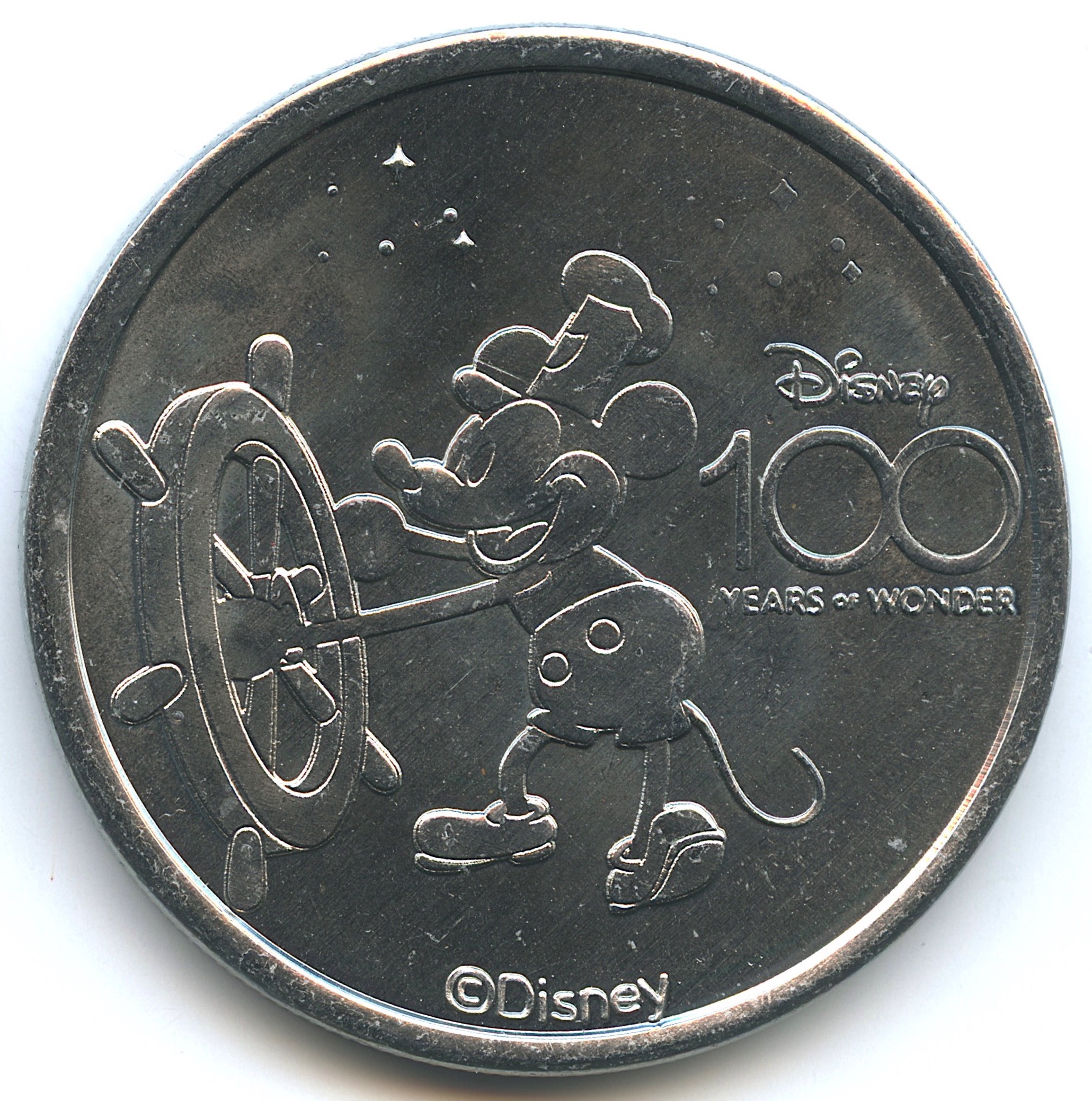 This coin measures 1.5" in diameter which is roughly the same size as a silver dollar. The medallion is exclusive to the Disneyland Park and commemorates the 100th Anniversary of Disney.