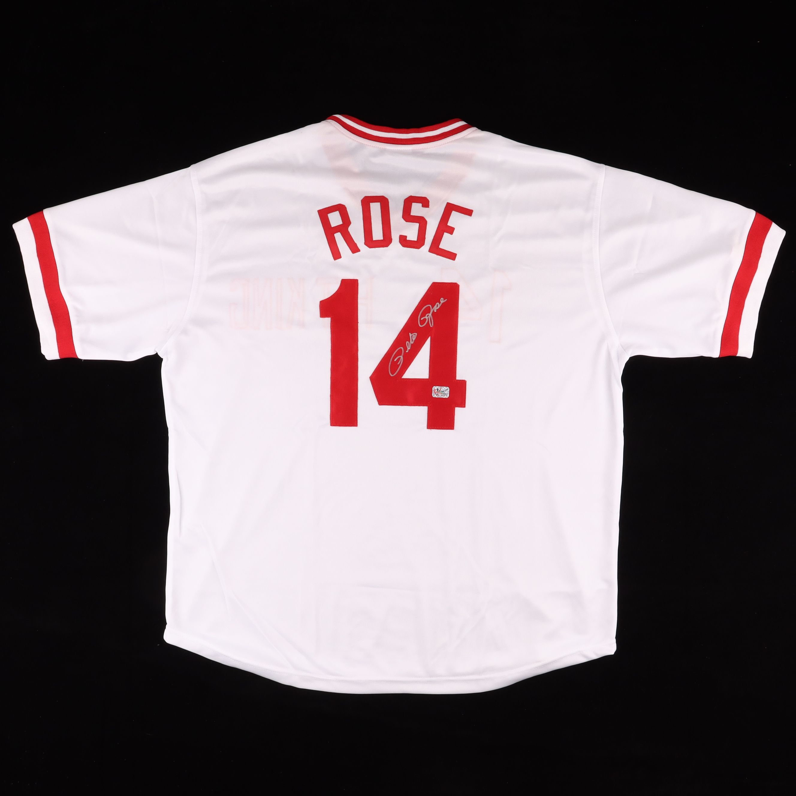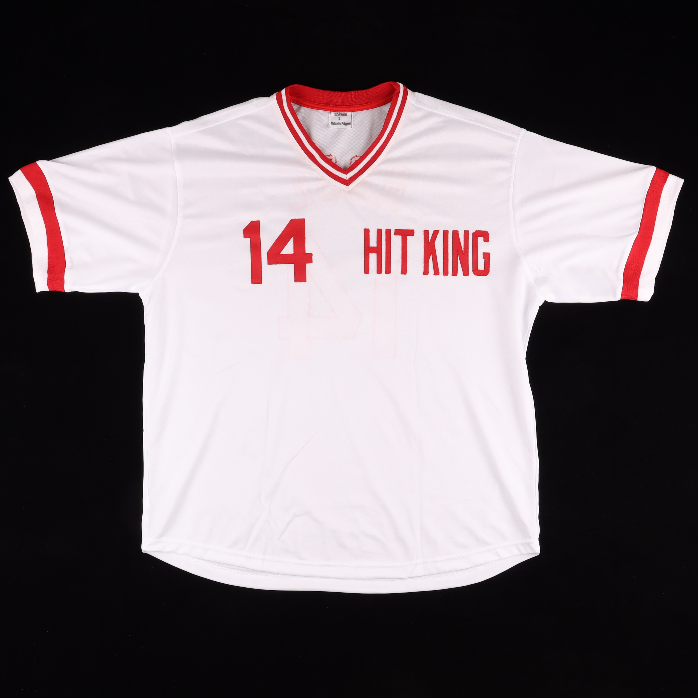 Custom jersey. Everything is sewn on, size XL. Has been hand-signed by Pete Rose.