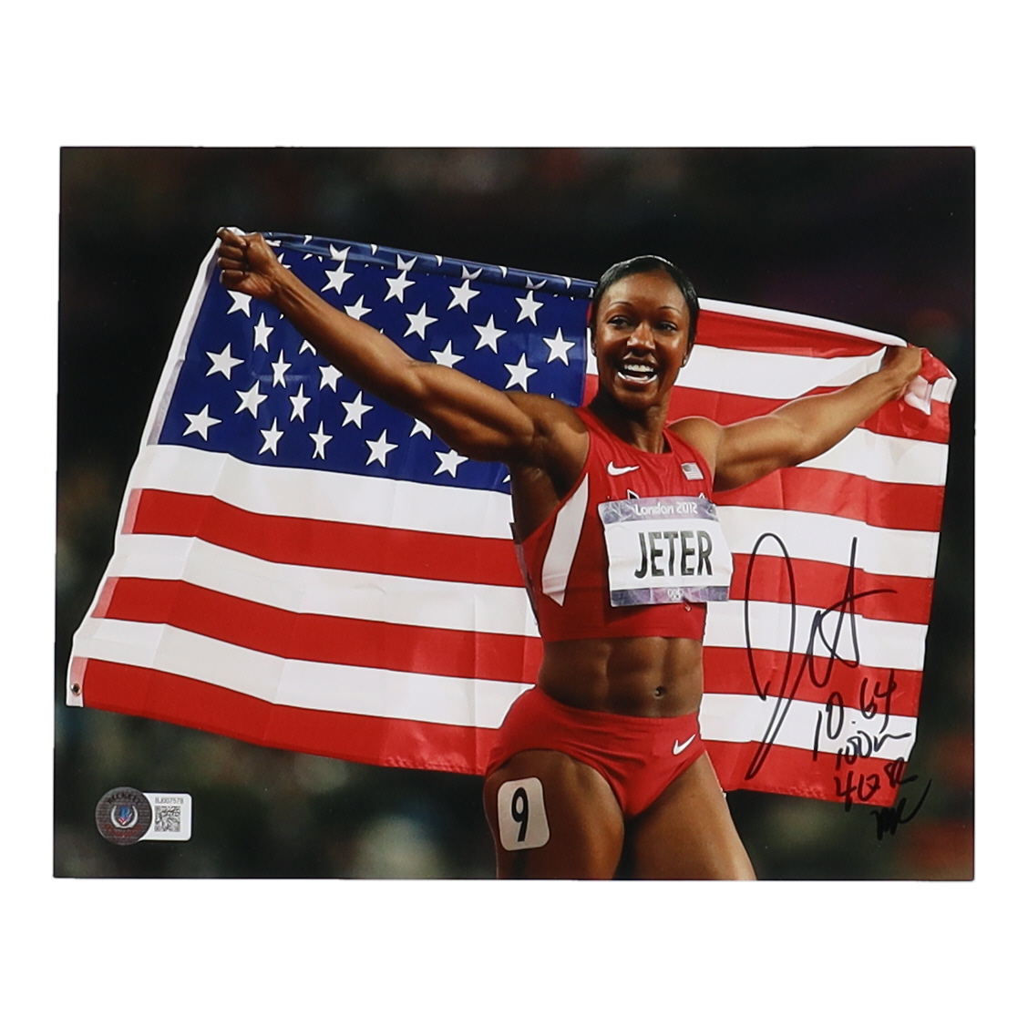 Carmelita Jeter Signed Team USA 8x10 Photo Inscribed "10.64 100m 40.82 WR" (Beckett)