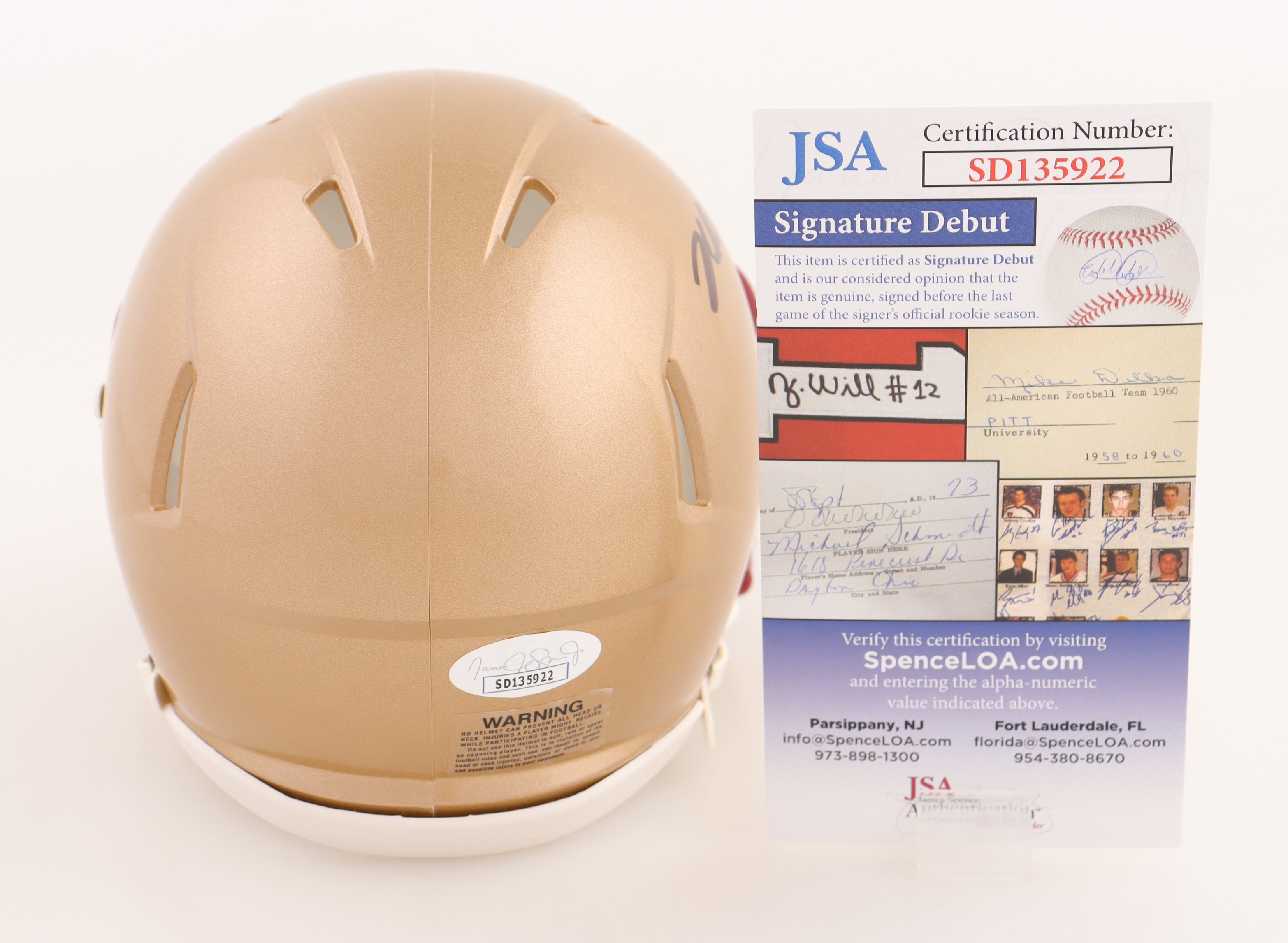 The autograph(s) includes an official James Spence Authentication (JSA) "Signature Debut" hologram and COA. "Signature Debut" is the autographed memorabilia equivalent to a rookie card. The JSA definition of a "Signature Debut" is as follows: "Any item that is autographed and received by JSA prior to the last game of the signer's official rookie season.