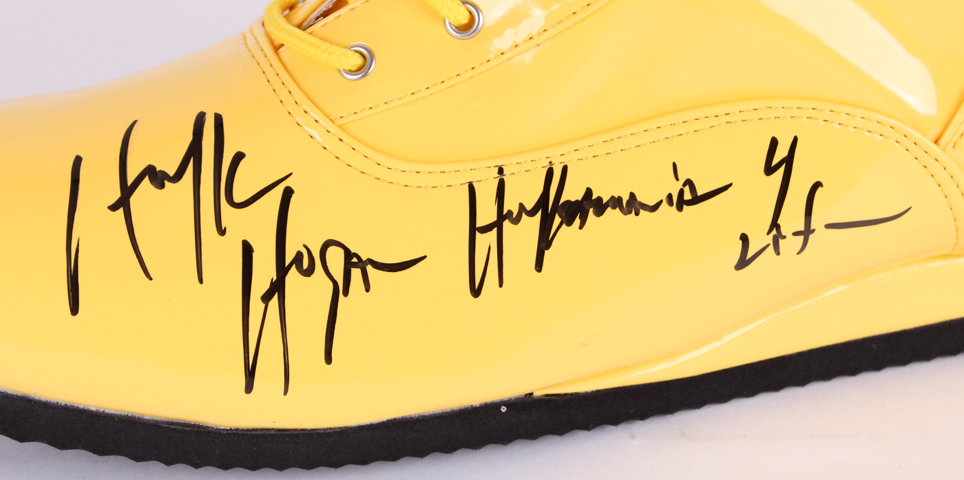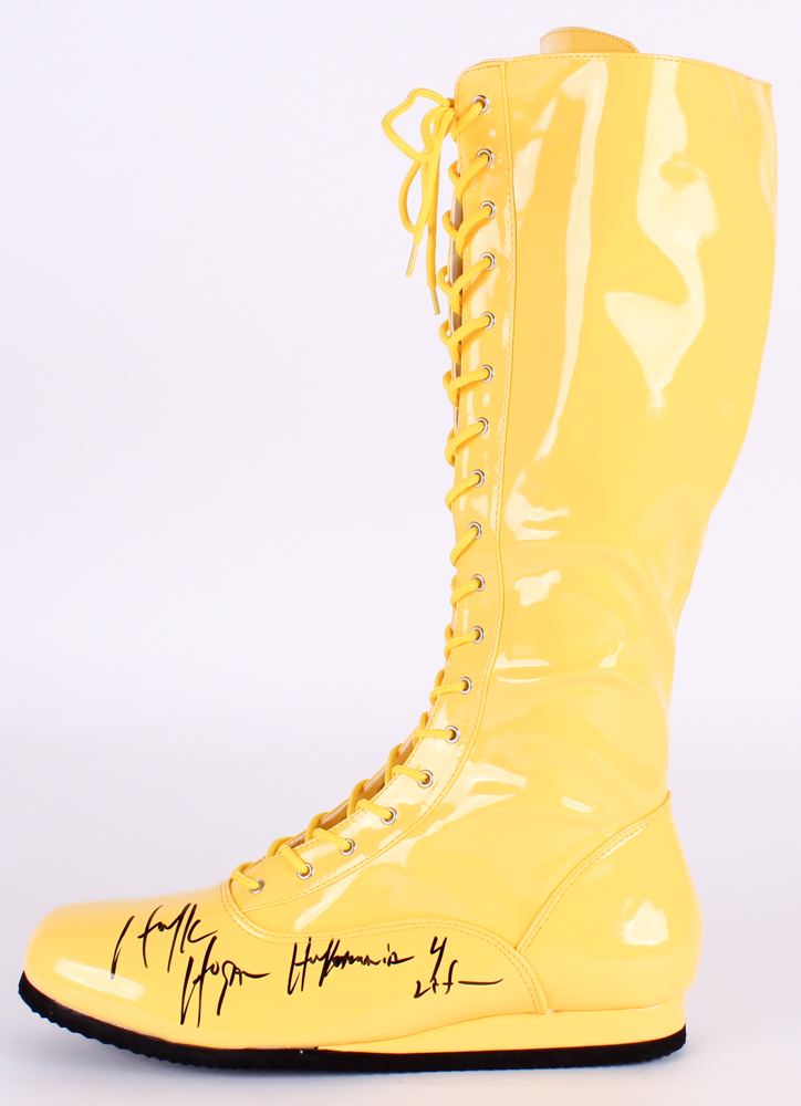 Wrestling boot hand-signed and inscribed in black felt-tip pen by Hulk Hogan.