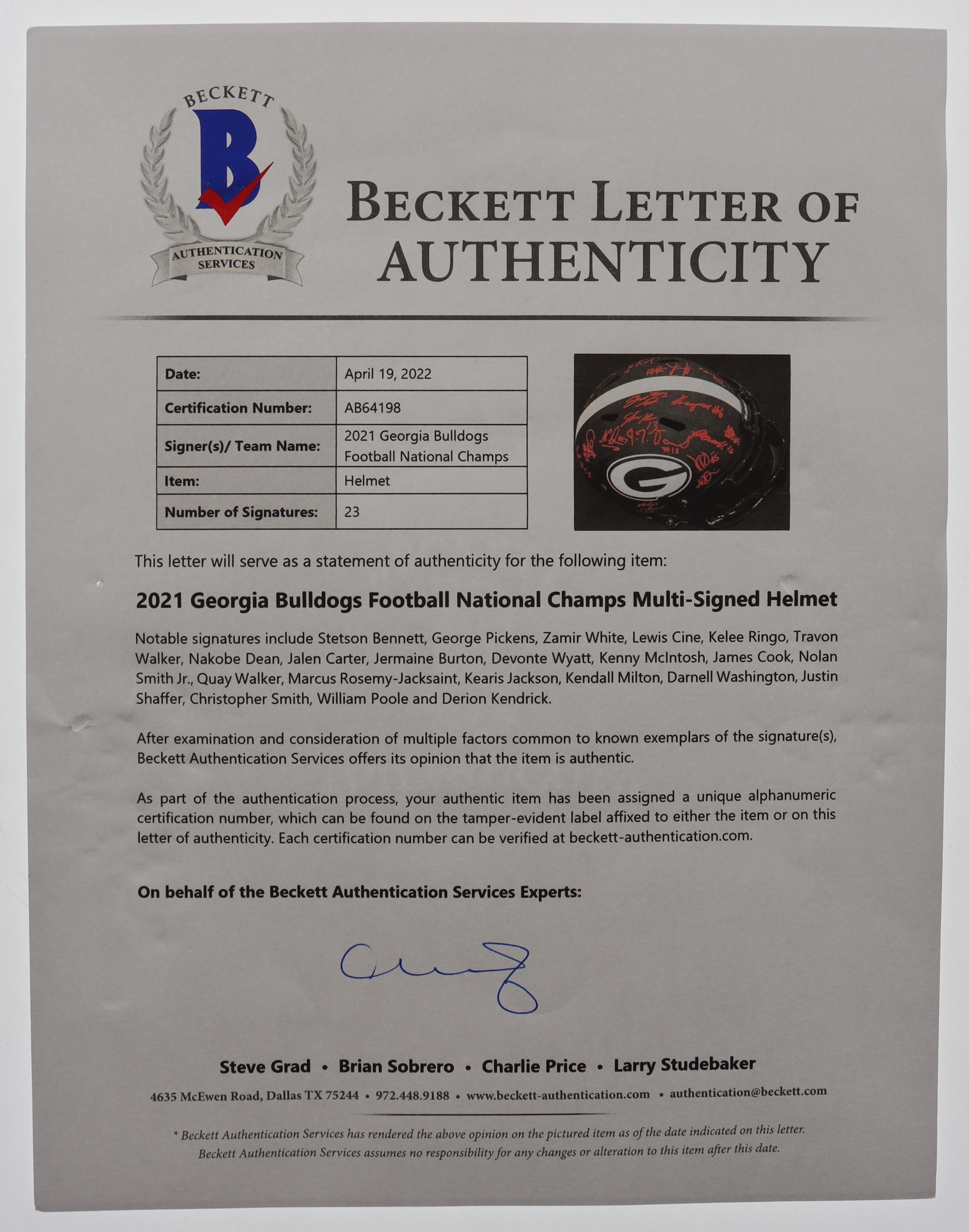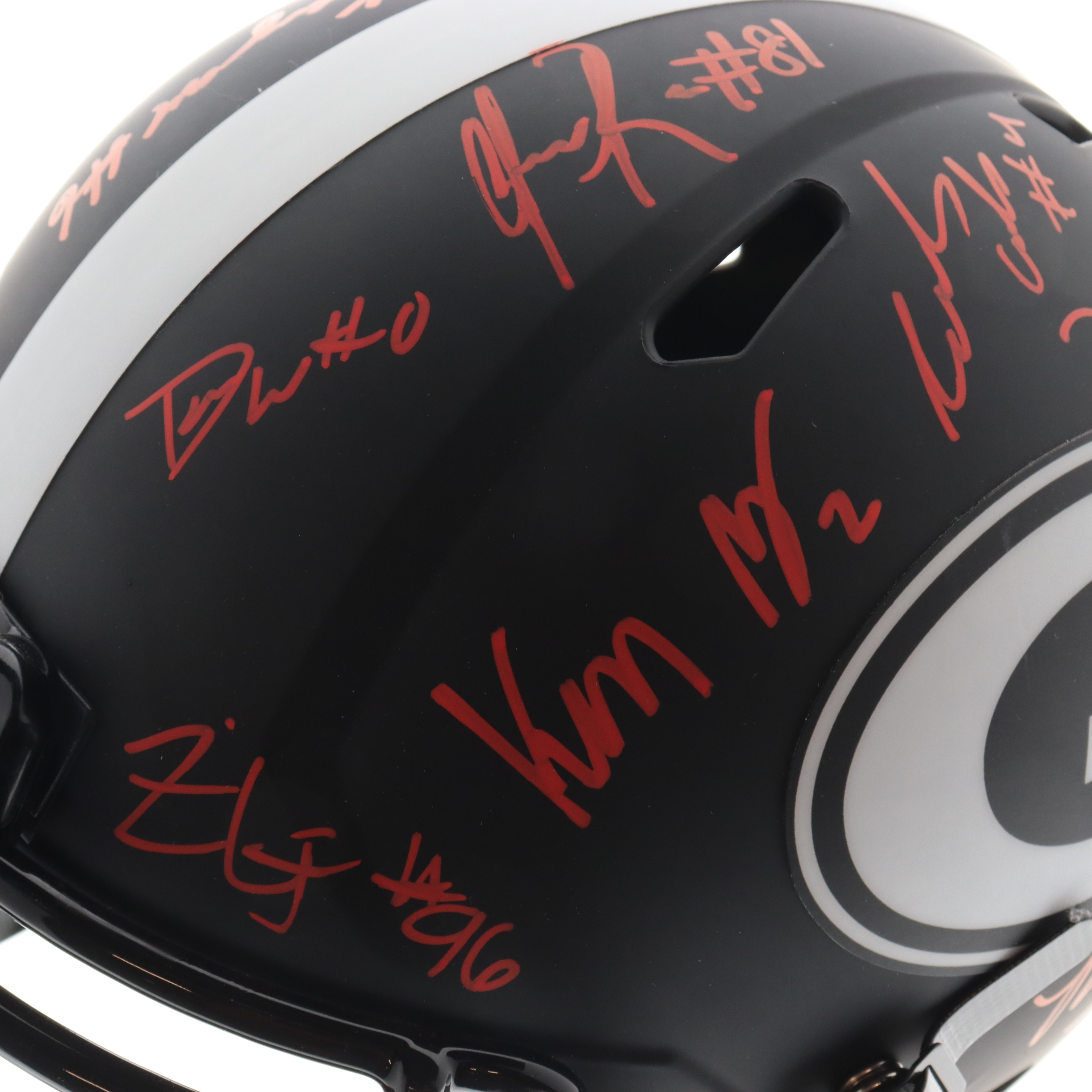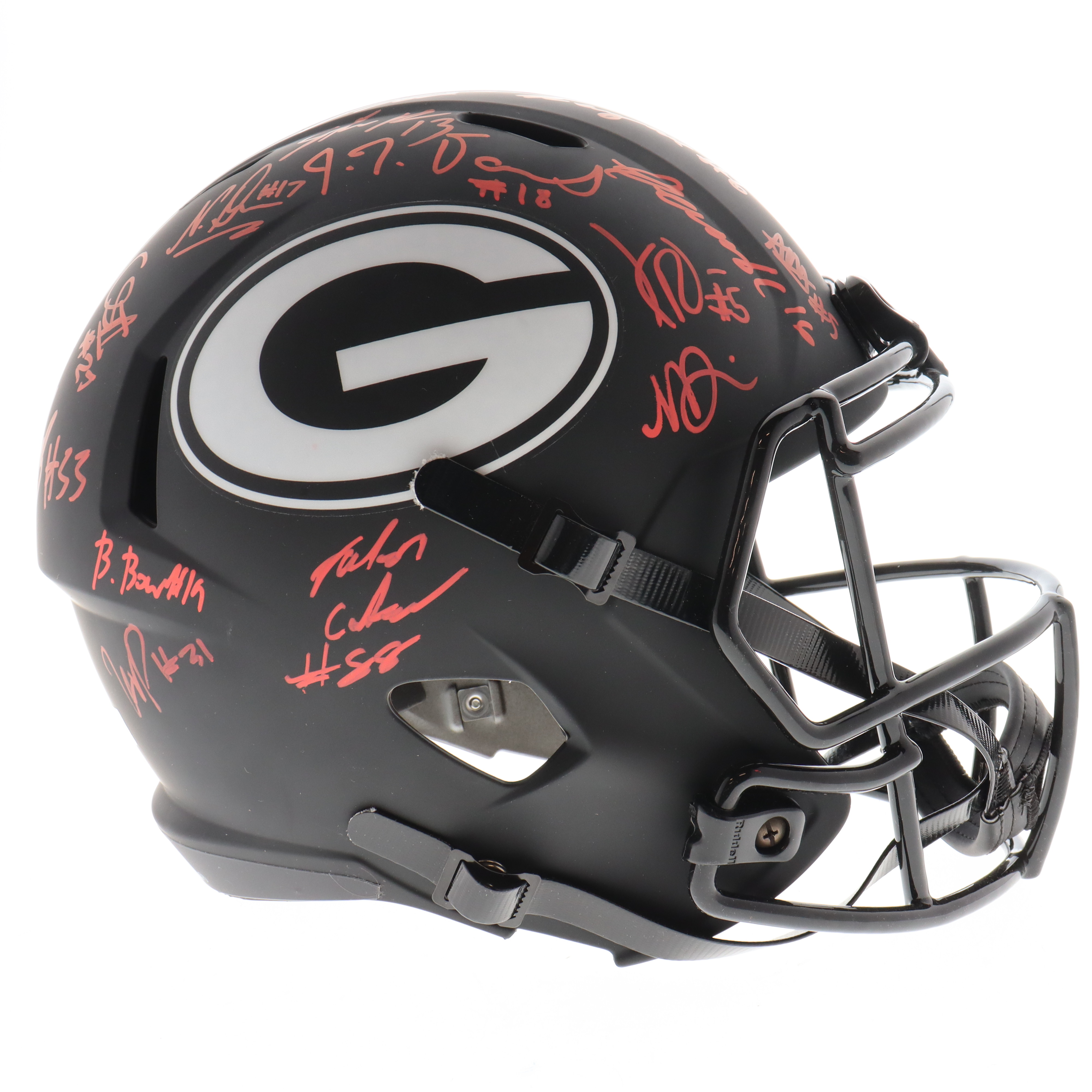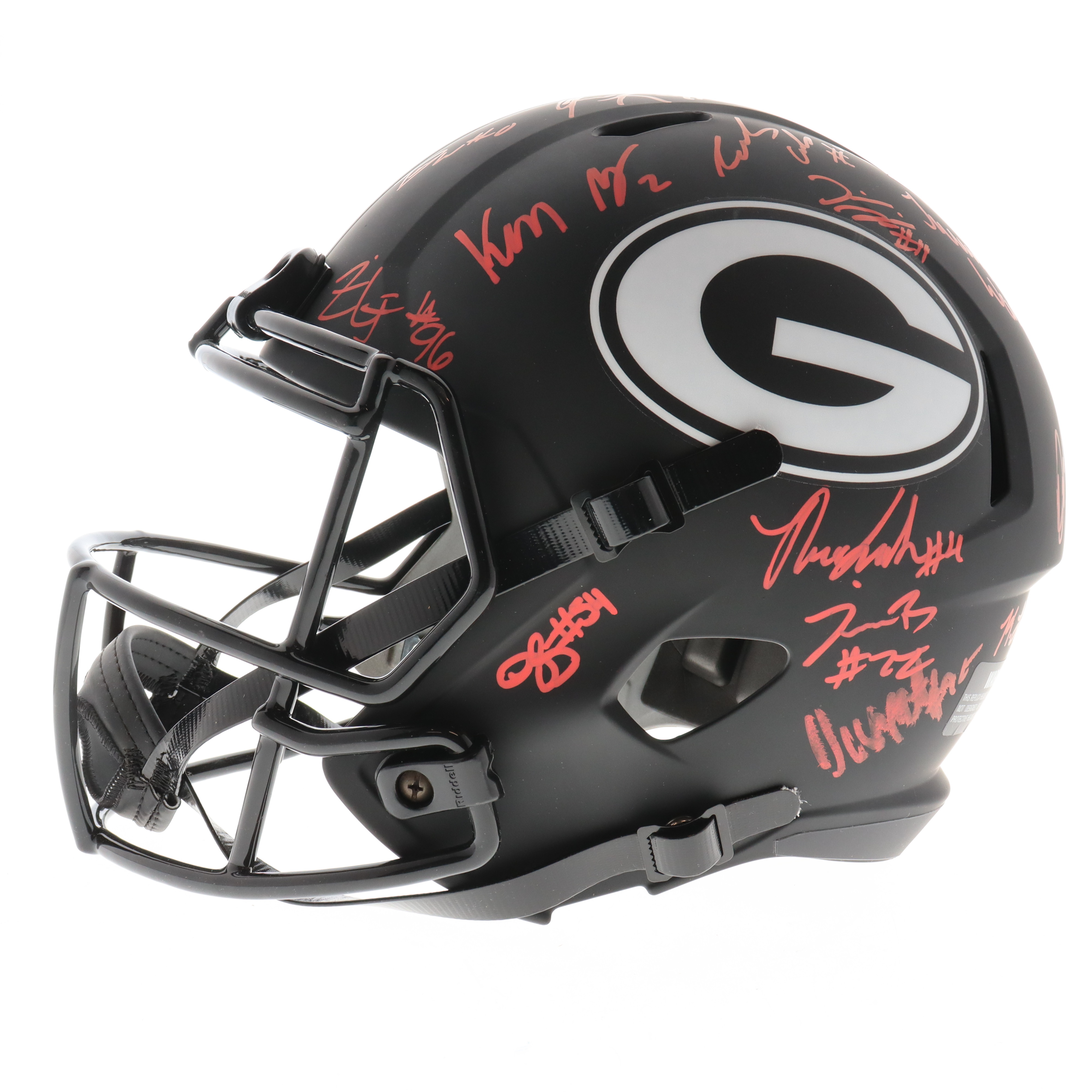 Riddell Georgia Bulldogs full-size replica Eclipse Alternate Speed helmet. Team-signed by (23) With tetson Bennett, George Pickens, Zamir White, Lewis Cine, Kelee Ringo, Travon Walker, Nakobe Dean, Jalen Carter, Jermaine Burton, Devonte Wyatt, Kenny McIntosh, James Cook, Nolan Smith Jr., Quay Walker, Marcus Rosemy-Jacksaint, Kearis Jackson, Kendall Milton, Darnell Washington, Justin Shaffer, Christopher Smith, William Poole, Derion Kendrick and (1) other.