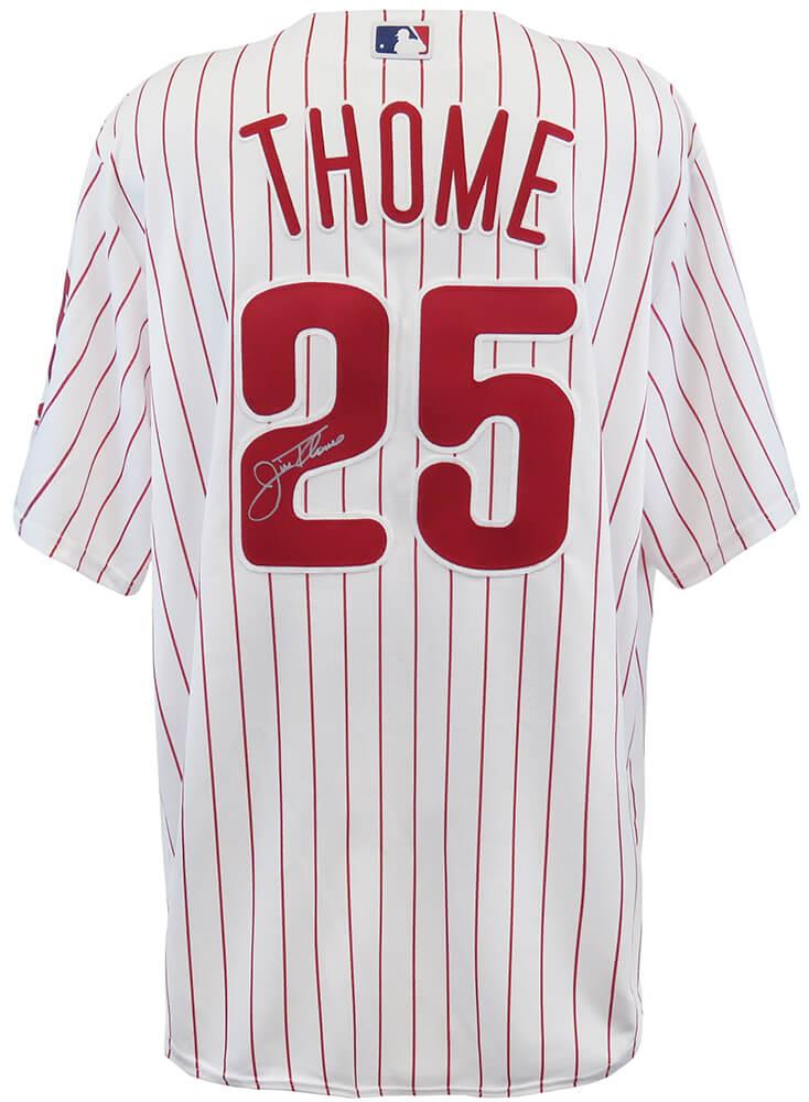 Majestic jersey with everything sewn on, size XL. Hand-signed by Jim Thome (Philadelphia Phillies, HOF).