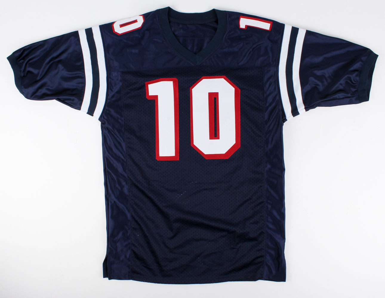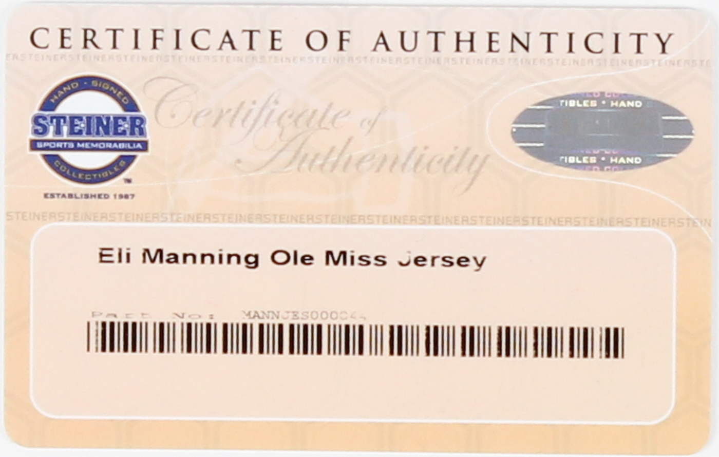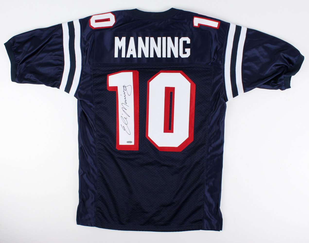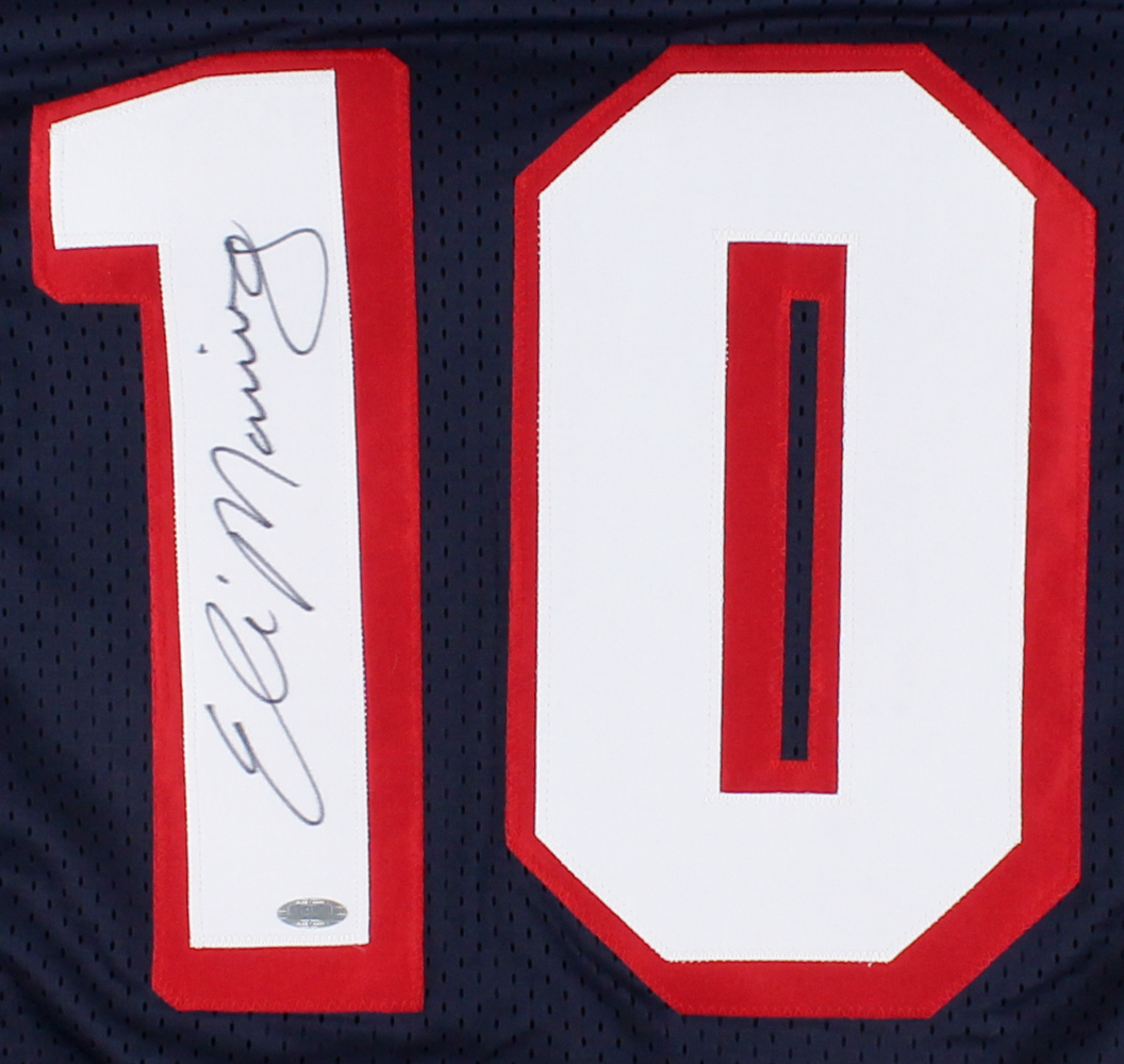 Custom on-field style jersey. Everything is sewn on, size XL. Hand-signed in black felt-tip pen by Eli Manning.