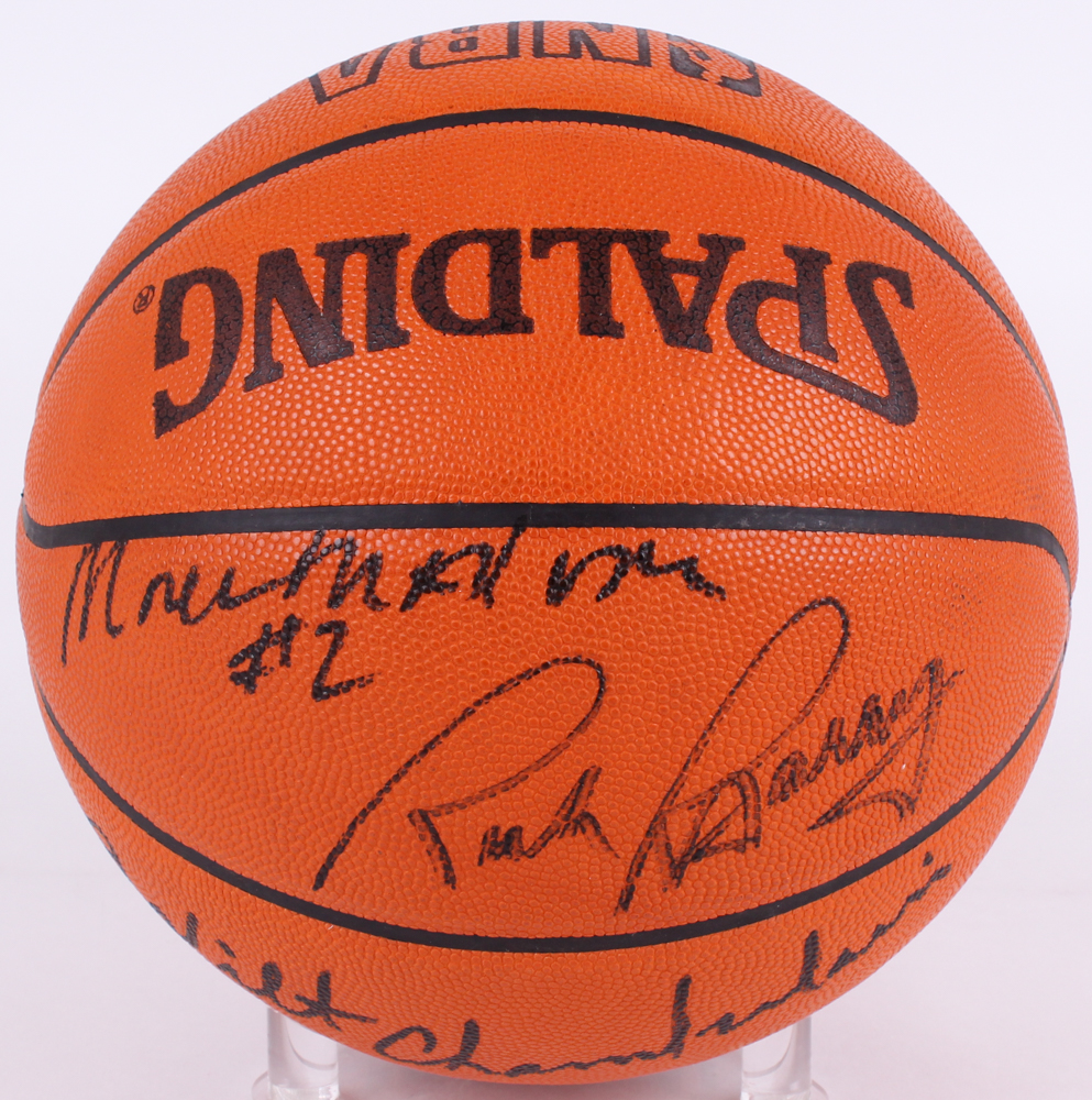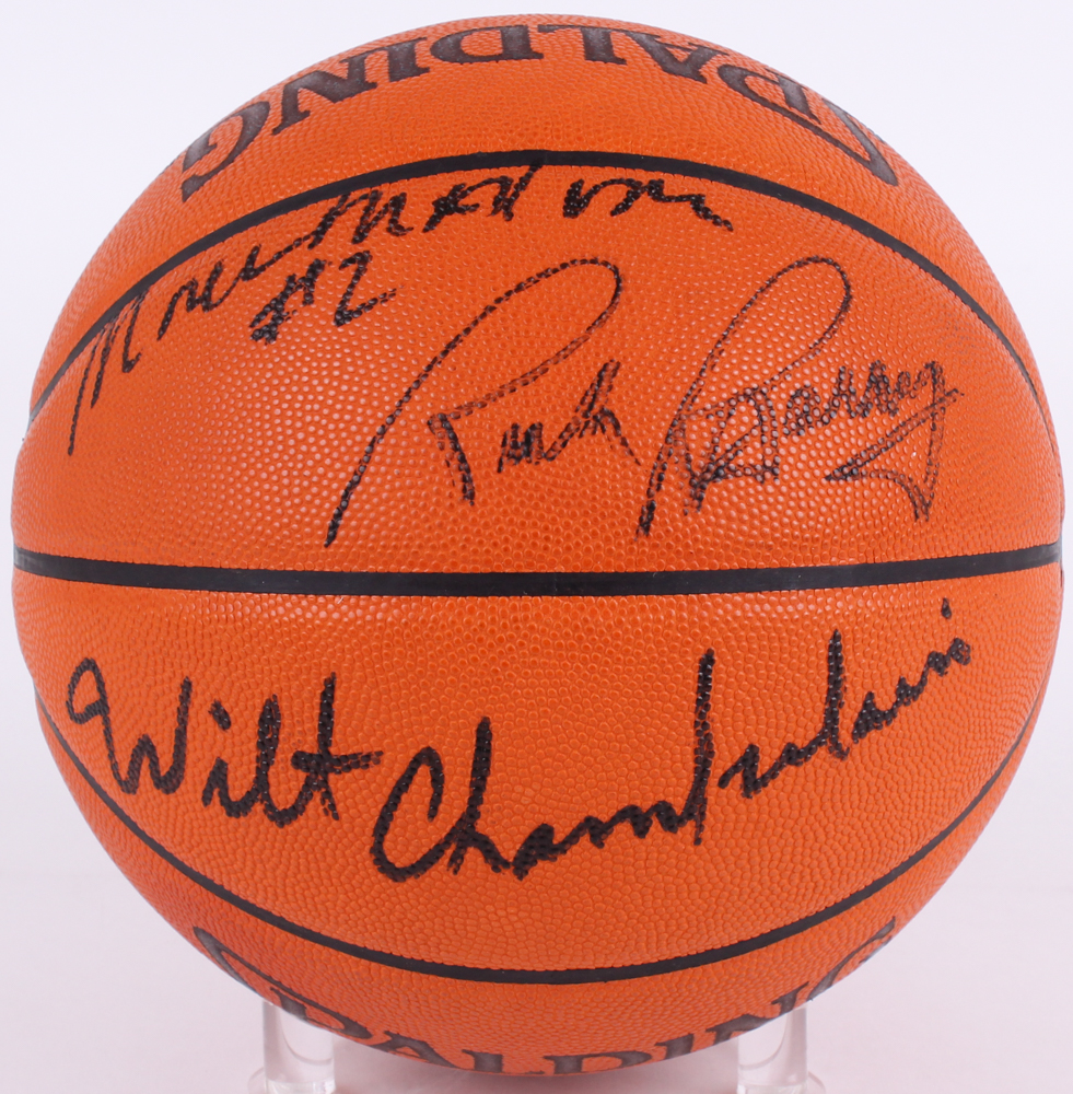 Spalding NBA full-size basketball has been hand-signed in black felt-tip pen by (10) basketball Hall of Famers including Wilt Chamberlain, Moses Malone, Rick Barry, Bob Cousy, Isiah Thomas, Dave DeBusschere, Nate Archibald, Walt Frazier, Elvin Hayes and George Gervin.