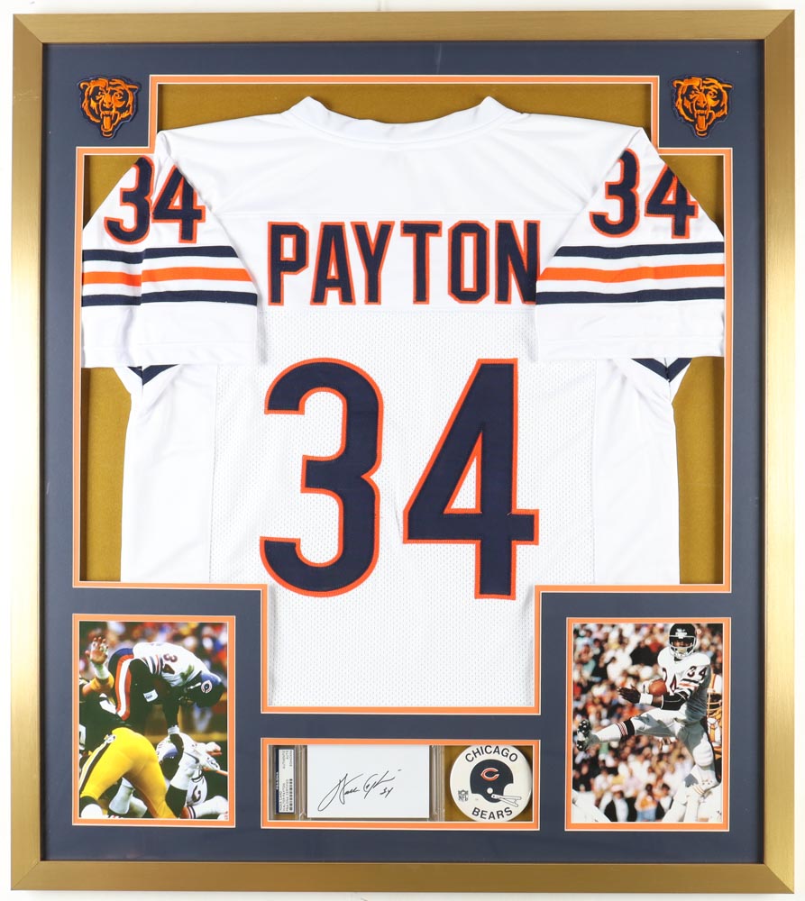 Walter Payton Signed Bears Custom Framed Cut Display with Jersey & Vintage Bears Pin (PSA)