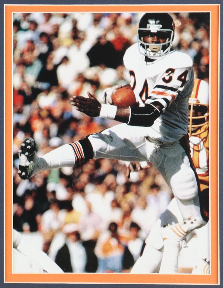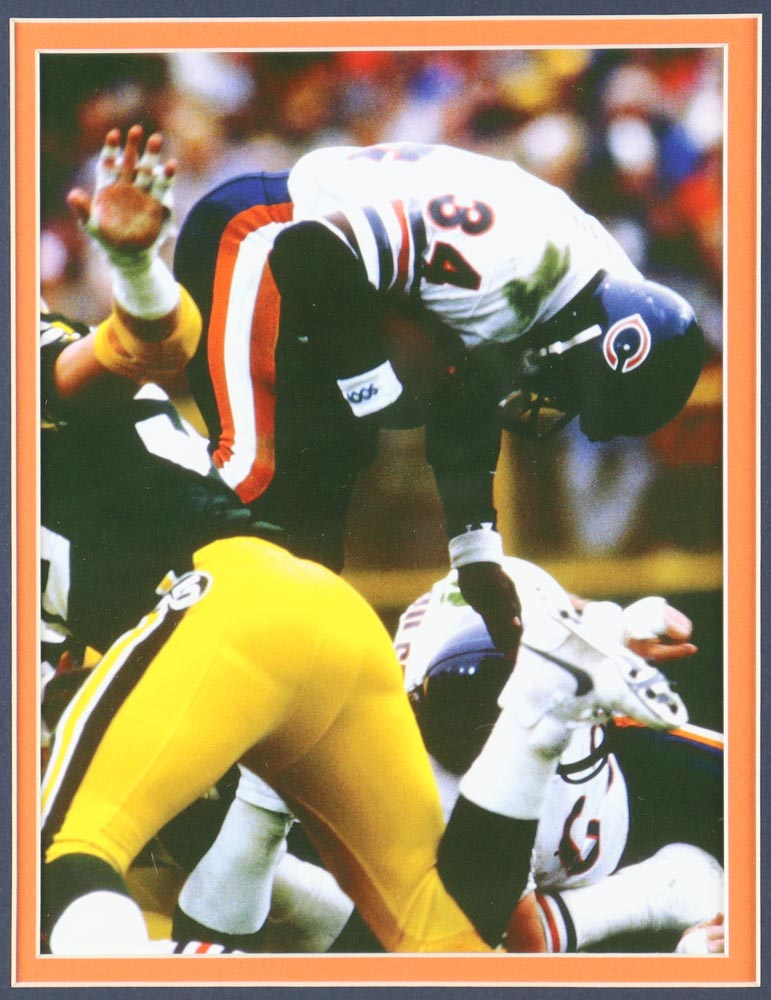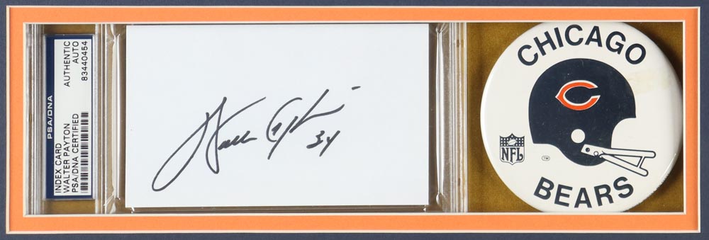 Custom frame measures 32" x 36" in size and features a (PSA) Encapsulated cut that has been hand-signed by Walter Payton (D. 1999, Chicago Bears, HOF). Also included in the display is an unsigned jersey and a Bears pin.