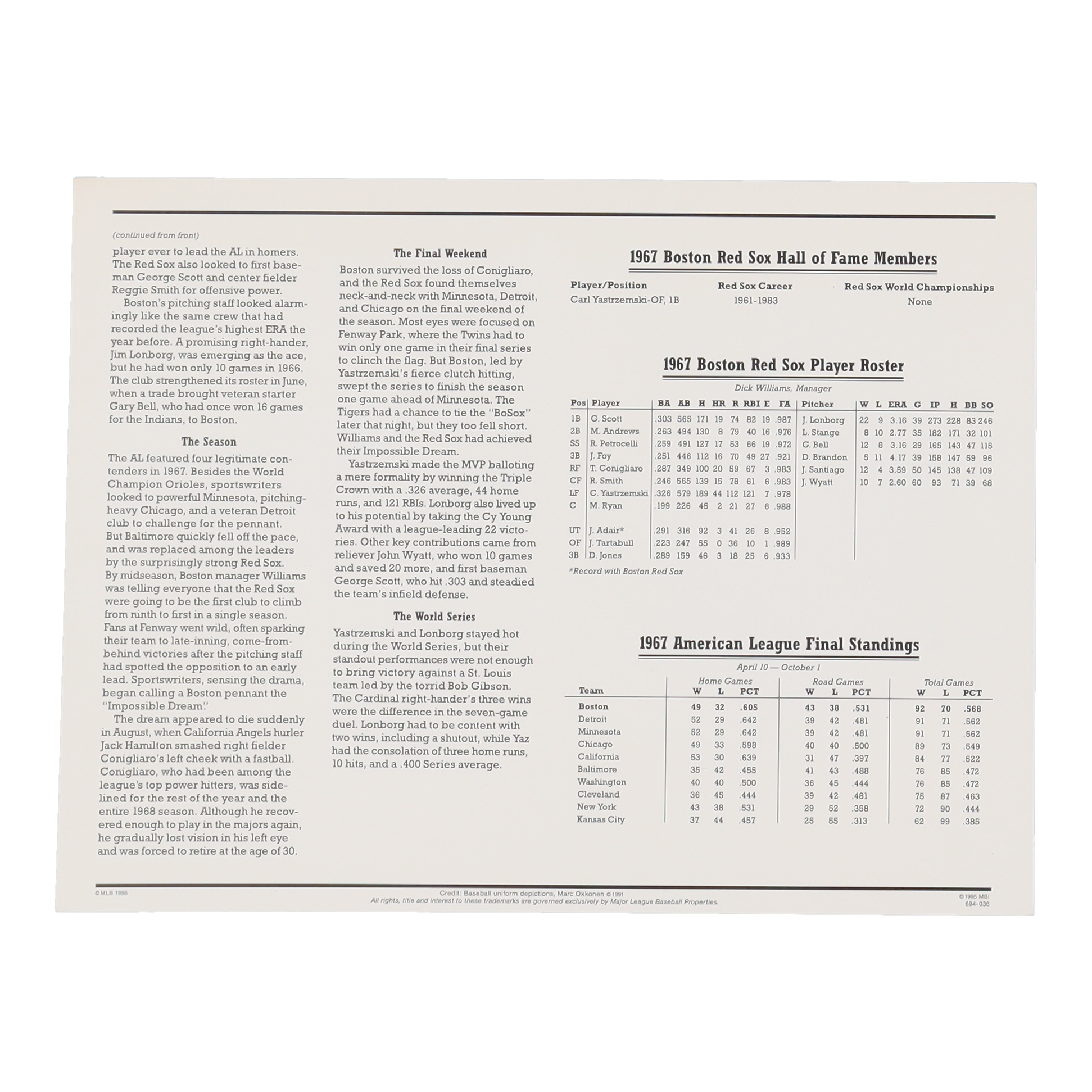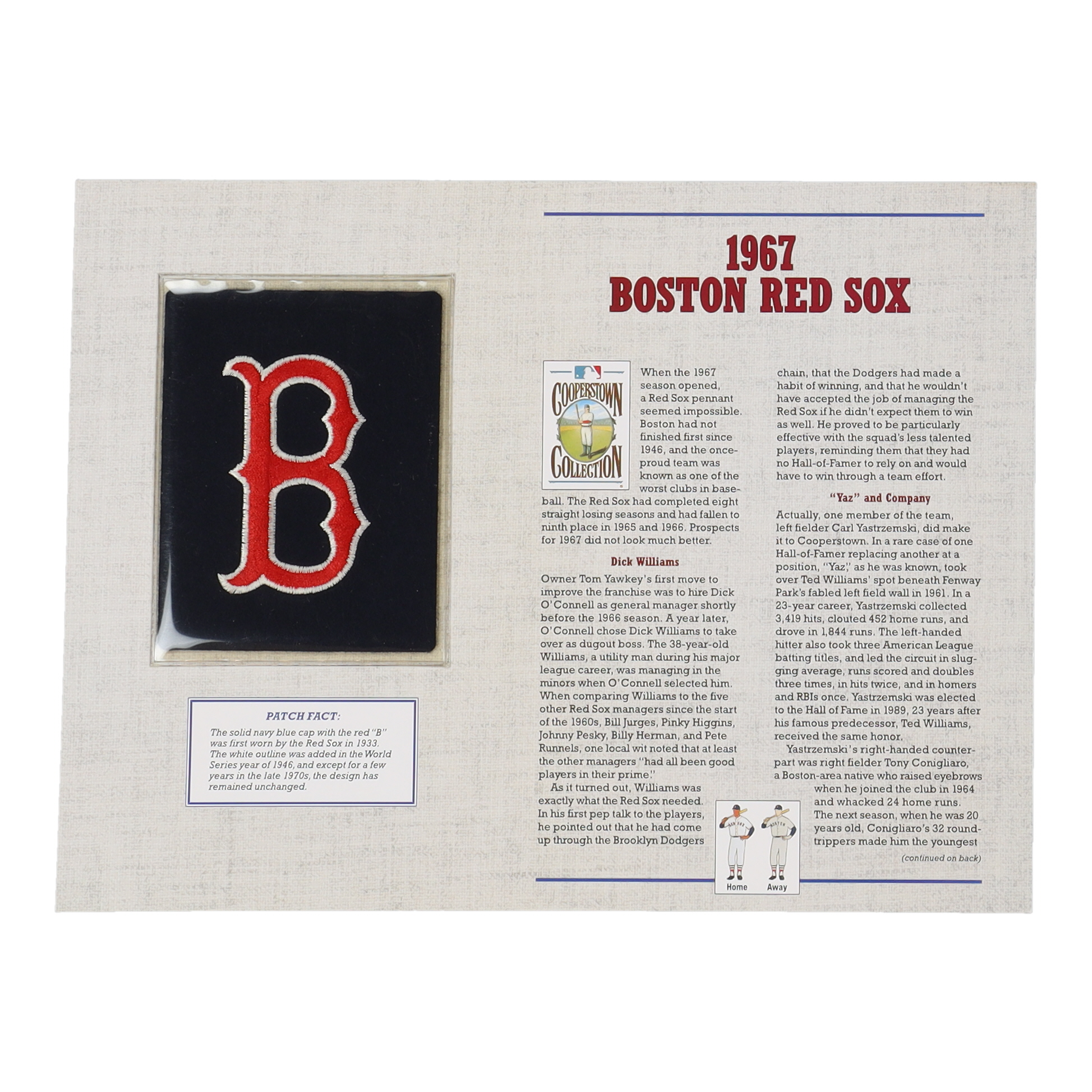 1967 Boston Red Sox Cooperstown Collection statistics commemorative stat card measures approximately 9" x 12" in size. Includes cloth uniform patch as shown.